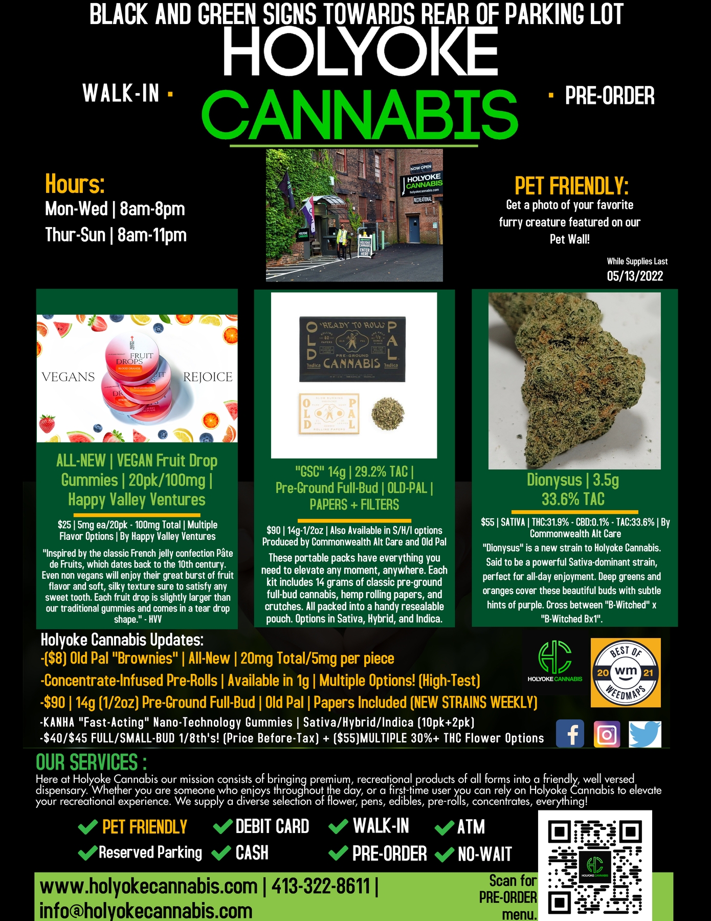 Holyoke Cannabis implements a wide range of sanitation and safety measures. Health and security are major priorities for their walk-in customers. “We are constantly sanitizing our sales floor and counterspace and offer both hand sanitizer and masks to all customers.” explains Jacob Black, Marketing and procurement Manager for Holyoke Cannabis. “Customers can also pre-order through our website www.holyokecannabis.com in order to decrease your time spent in store. We take our customers safety concerns extremely seriously.”. If you have any questions or concerns, please call 413-322-8611 and a Holyoke Cannabis Bud Tender will have the answer you need.