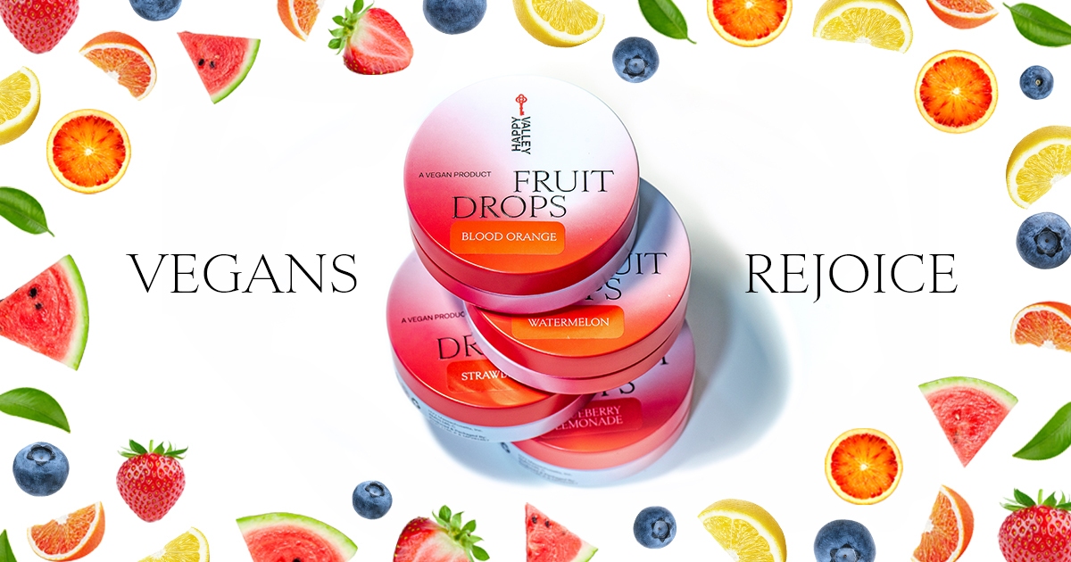“Inspired by the classic French jelly confection Pâte de Fruits, which dates back to the 10th century. Even non vegans will enjoy their great burst of fruit flavor and soft, silky texture sure to satisfy any sweet tooth. Each fruit drop is slightly larger than our traditional gummies and comes in a tear drop shape.” – Happy Valley