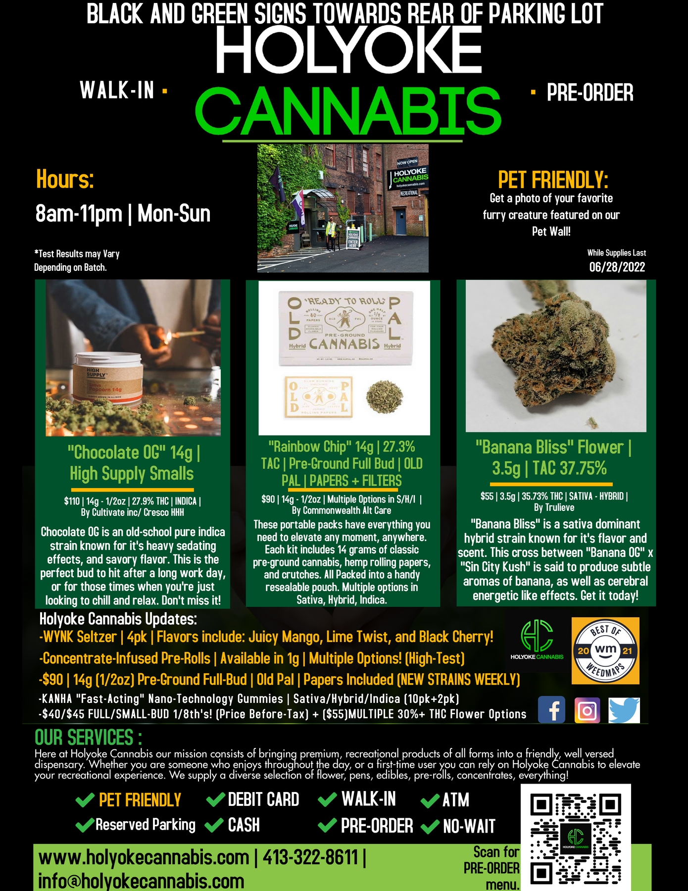 Holyoke Cannabis implements a wide range of sanitation and safety measures. Health and security are major priorities for their walk-in customers. “We are constantly sanitizing our sales floor and counterspace and offer both hand sanitizer and masks to all customers.” explains Jacob Black, Marketing and procurement Manager for Holyoke Cannabis. “Customers can also pre-order through our website www.holyokecannabis.com in order to decrease your time spent in store. We take our customers safety concerns extremely seriously.”. If you have any questions or concerns, please call 413-322-8611 and a Holyoke Cannabis Bud Tender will have the answer you need.