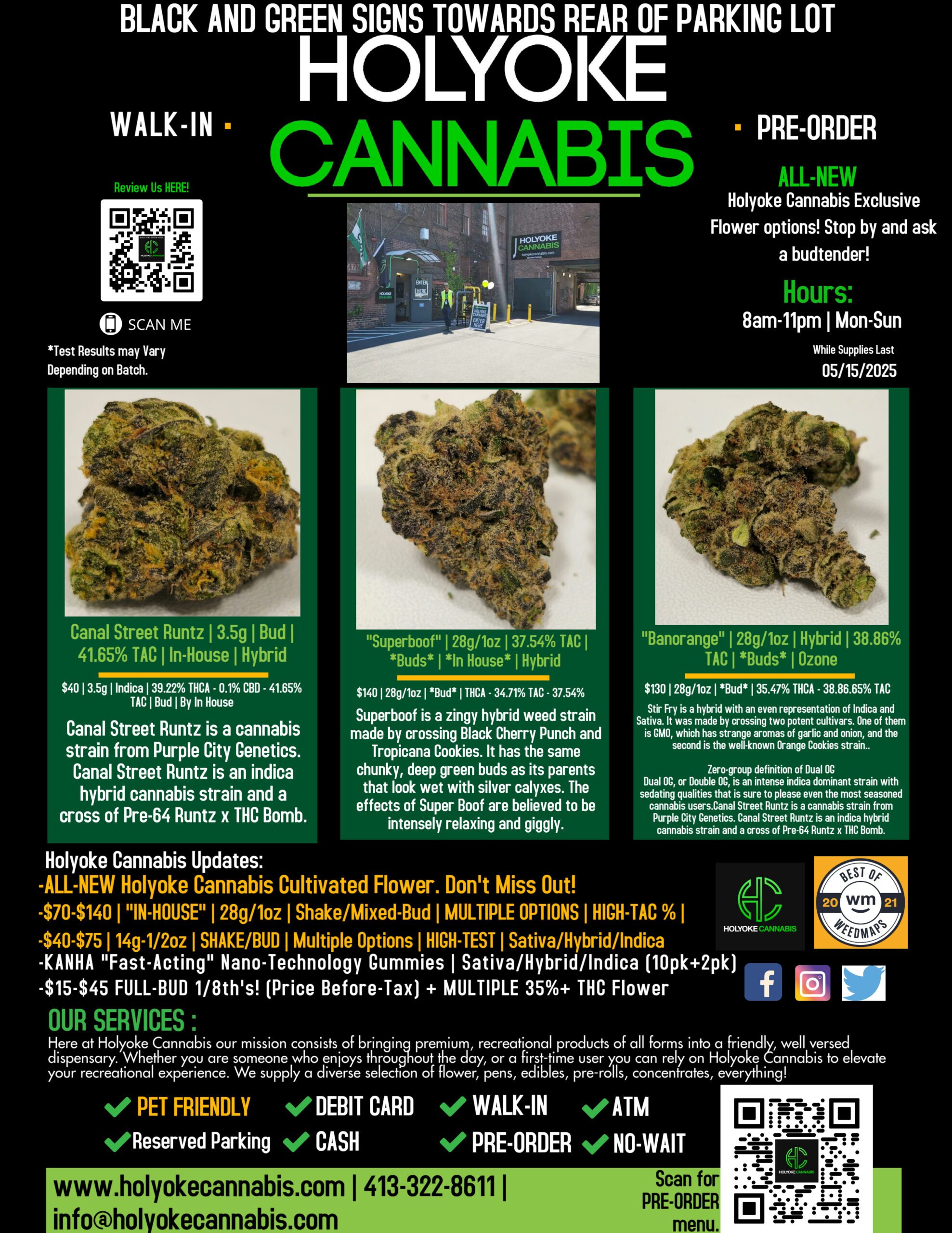 What’s good Holyoke Cannabis tokers? Today we’ll be highlighting some of our favorite brands and products including “Canal Street Runtz” 3.5g Bud Flower by In House, Ozone “Banorange” 28g/1oz *Bud* by Massgrow/Ozone and In House “Superboof” 28g/1oz *BUD* by ARL/In-House Flower! If you’re not really into flower, there’s tons of concentrate options at Holyoke Cannabis Dispensary you can check out HERE.