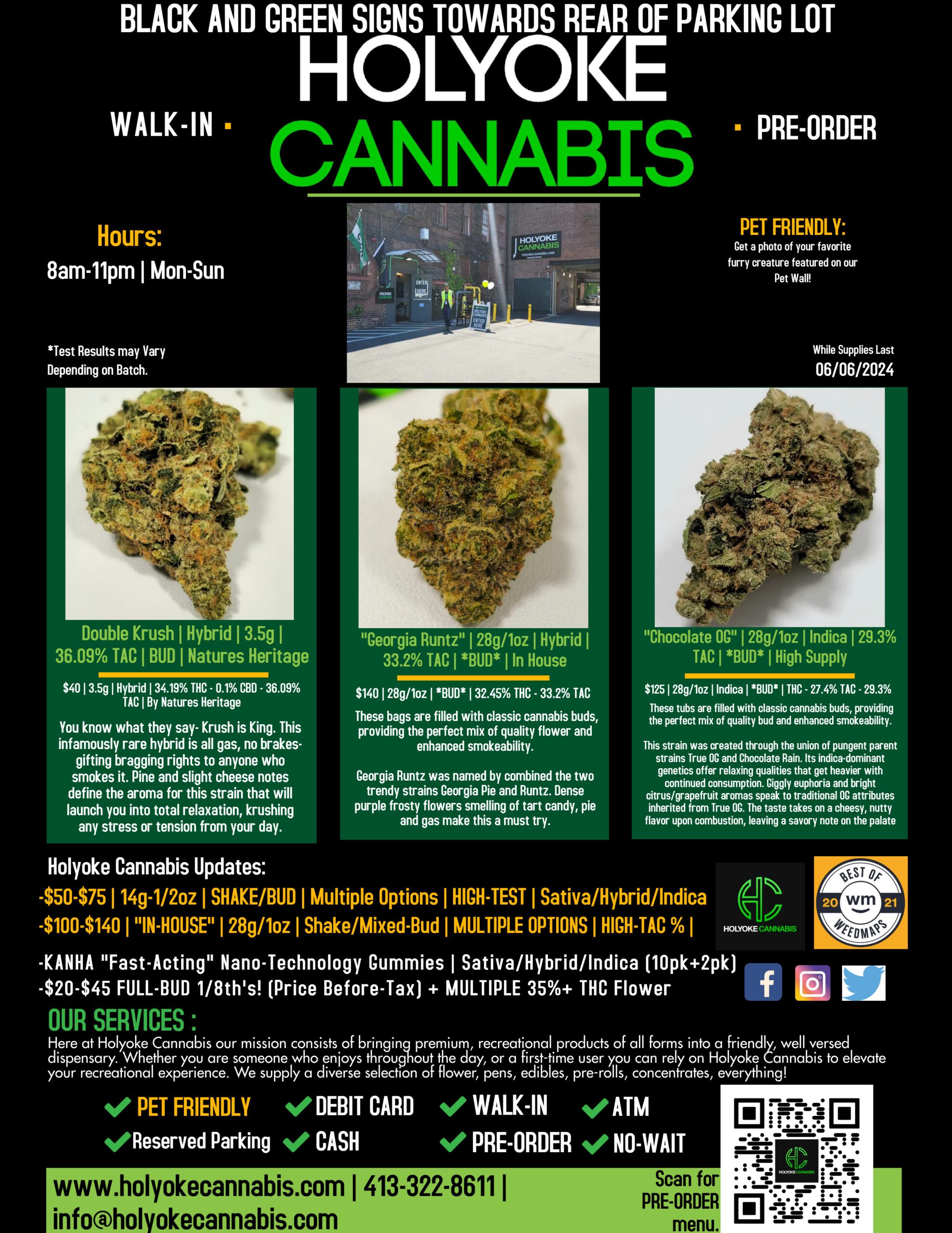 What’s good Holyoke Cannabis tokers? Today we’ll be highlighting some of our favorite brands and products including “Double Krush” Flower by Natures Heritage. “Georgia Runtz” 28g/1oz *BUD* by High Supply and “Chocolate OG” 28g/1oz *BUD* by In House. If you’re not really into flower, there’s tons of concentrate options at Holyoke Cannabis Dispensary you can check out HERE.
