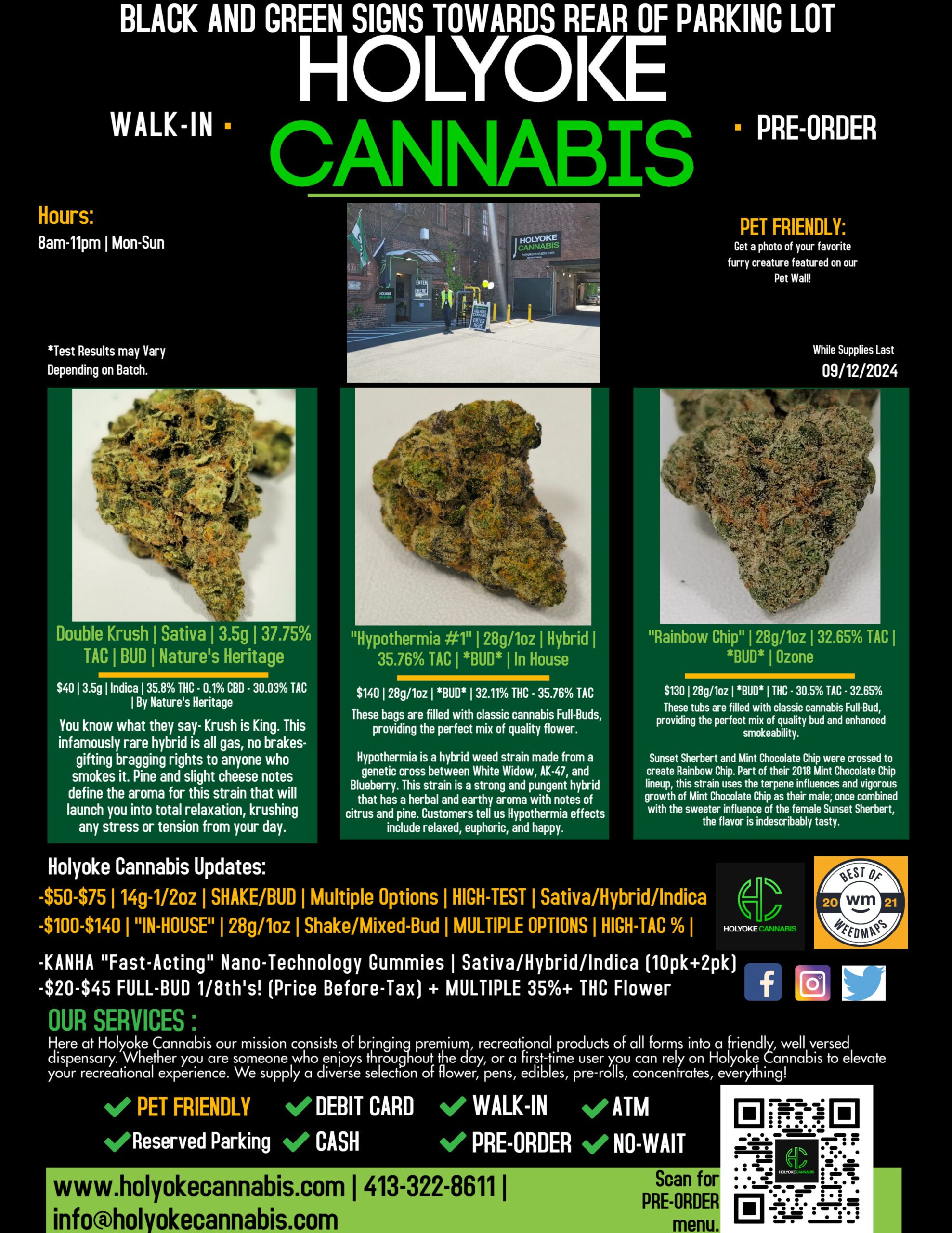 What’s good Holyoke Cannabis tokers? Today we’ll be highlighting some of our favorite brands and products including “Double Krush” Flower by Nature’s Heritage. “Hypothermia #1” 28g/1oz *BUD* by In House and Rainbow Chip“” 28g/1oz *BUD* by Ozone. If you’re not really into flower, there’s tons of concentrate options at Holyoke Cannabis Dispensary you can check out HERE.