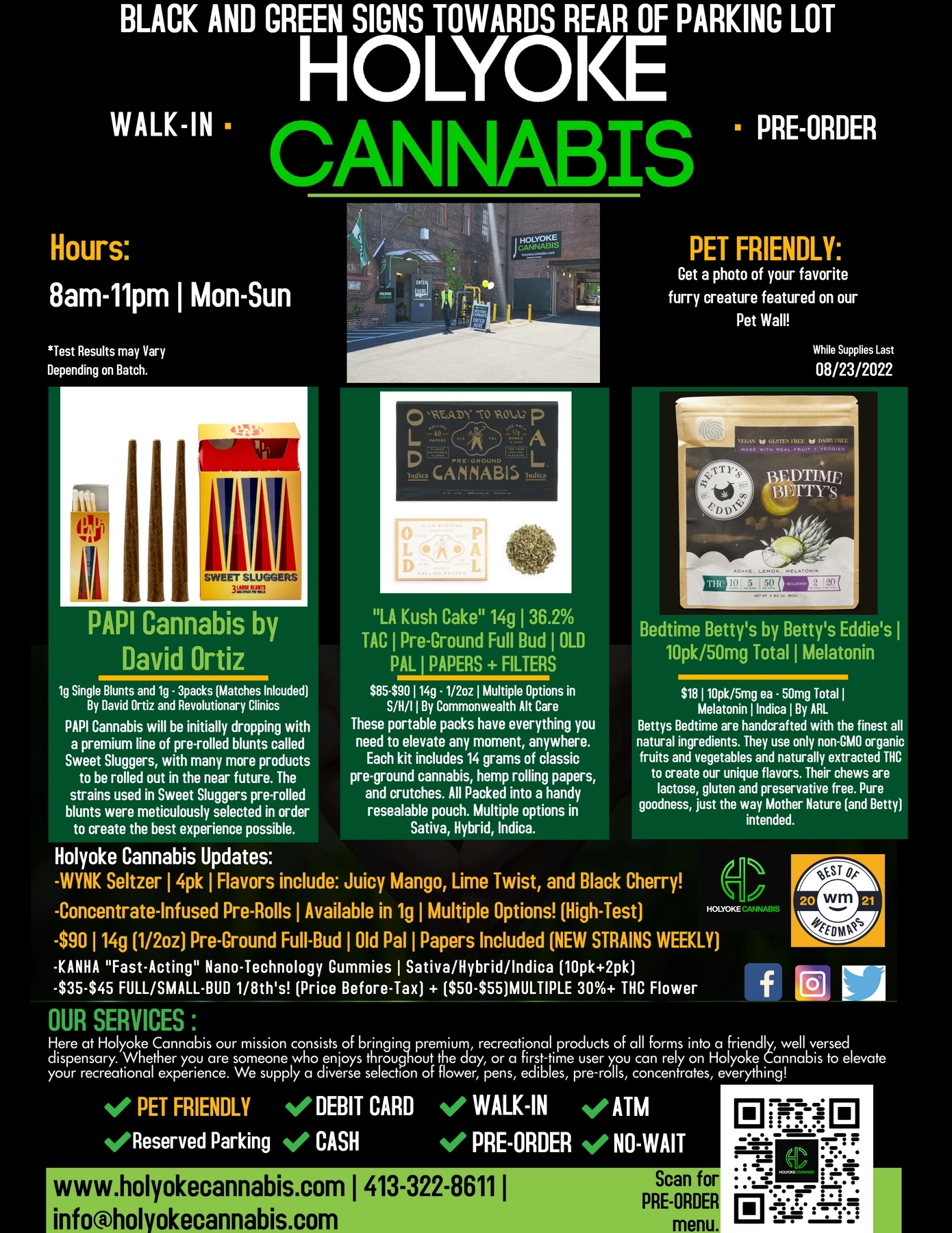 Holyoke Cannabis aplica una amplia gama de medidas sanitarias y de seguridad. La salud y la seguridad son prioritarias para sus clientes. "Desinfectamos constantemente el suelo y los mostradores y ofrecemos desinfectante de manos y mascarillas a todos los clientes", explica Jacob Black, director de marketing y adquisiciones de Holyoke Cannabis. "Los clientes también pueden hacer pedidos anticipados a través de nuestro sitio web www.holyokecannabis.com para reducir el tiempo que pasa en la tienda. Nos tomamos la seguridad de nuestros clientes muy en serio". Si tiene alguna pregunta o duda, por favor llame al 413-322-8611 y un Bud Tender de Holyoke Cannabis tendrá la respuesta que necesita.
