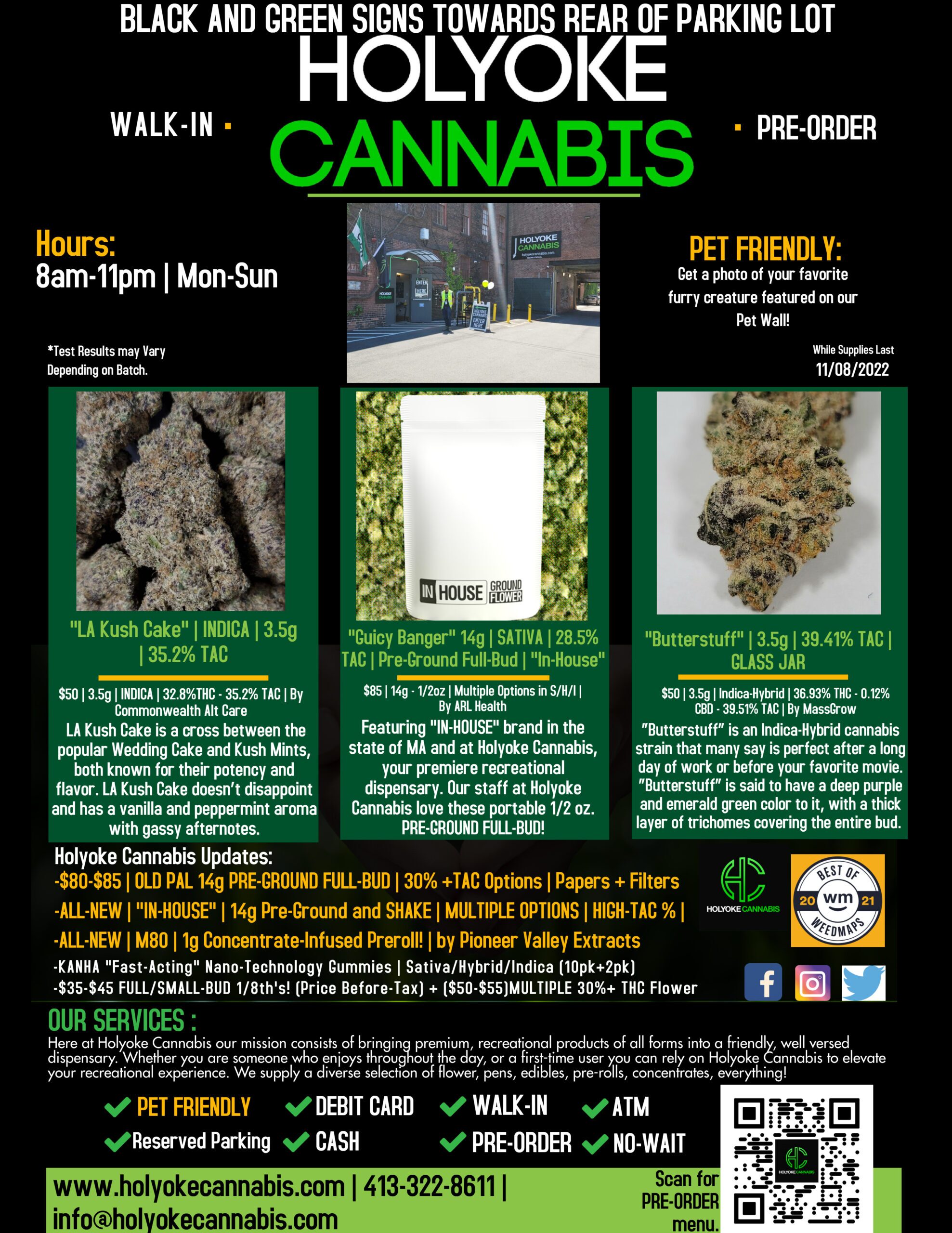 ¿Qué es bueno Holyoke Cannabis tokers? Hoy vamos a destacar algunas de nuestras marcas y productos favoritos, incluyendo “Butterstuff” Flower” por MassGrow, “LA Kush Cake” Flower by Commonwealth Alt Care y “Guicy Banger” 14g “In-House” Pre-Ground Bag by ARL Health. Si lo tuyo no son las flores, en Holyoke Cannabis Dispensary hay montones de opciones de concentrados que puedes consultar AQUÍ.