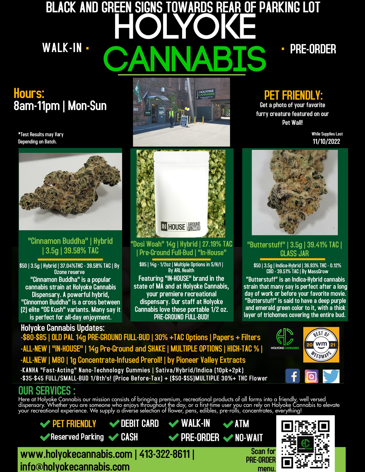 ¿Qué es bueno Holyoke Cannabis tokers? Hoy vamos a destacar algunas de nuestras marcas y productos favoritos, incluyendo “Butterstuff” Flower” por MassGrow, “Cinnamon Buddha” Flower by MassGrow y “Dosi Woah” 14g “In-House” Pre-Ground Bag por ARL Health. Si lo tuyo no son las flores, en Holyoke Cannabis Dispensary hay montones de opciones de concentrados que puedes consultar AQUÍ.