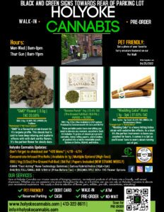 Holyoke Cannabis aplica una amplia gama de medidas sanitarias y de seguridad. La salud y la seguridad son prioritarias para sus clientes. "Desinfectamos constantemente el suelo y los mostradores y ofrecemos desinfectante de manos y mascarillas a todos los clientes", explica Jacob Black, director de marketing y adquisiciones de Holyoke Cannabis. "Los clientes también pueden hacer pedidos anticipados a través de nuestro sitio web www.holyokecannabis.com para reducir el tiempo que pasa en la tienda. Nos tomamos la seguridad de nuestros clientes muy en serio". Si tiene alguna pregunta o duda, por favor llame al 413-322-8611 y un Bud Tender de Holyoke Cannabis tendrá la respuesta que necesita.