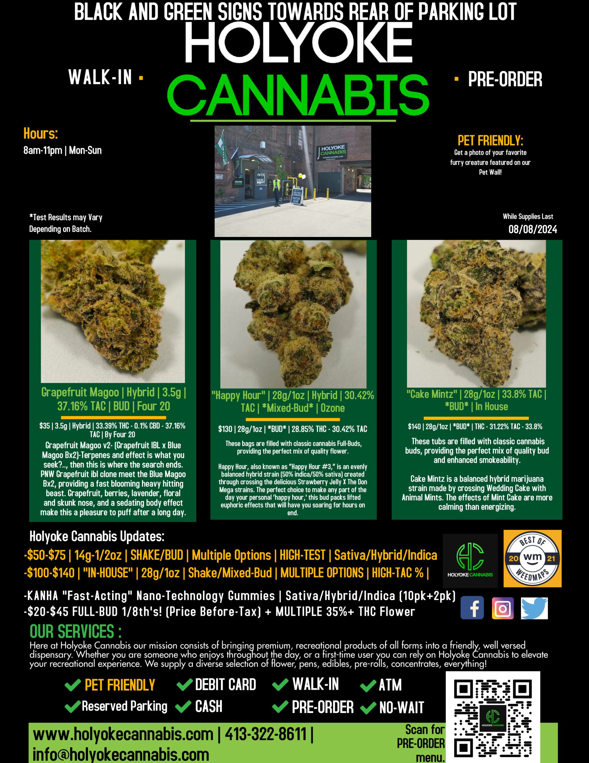 ¿Qué es bueno Holyoke Cannabis tokers? Hoy vamos a destacar algunas de nuestras marcas y productos favoritos, incluyendo "Pomelo Magoo" Flor por cuatro 20. “Happy Hour” 28g/1oz *Mixed-Bud* por In House y “Cake Mintz” 28g/1oz *BUD* por In House. Si no te gustan mucho las flores, en Holyoke Cannabis Dispensary hay montones de opciones de concentrados que puedes consultar AQUÍ.