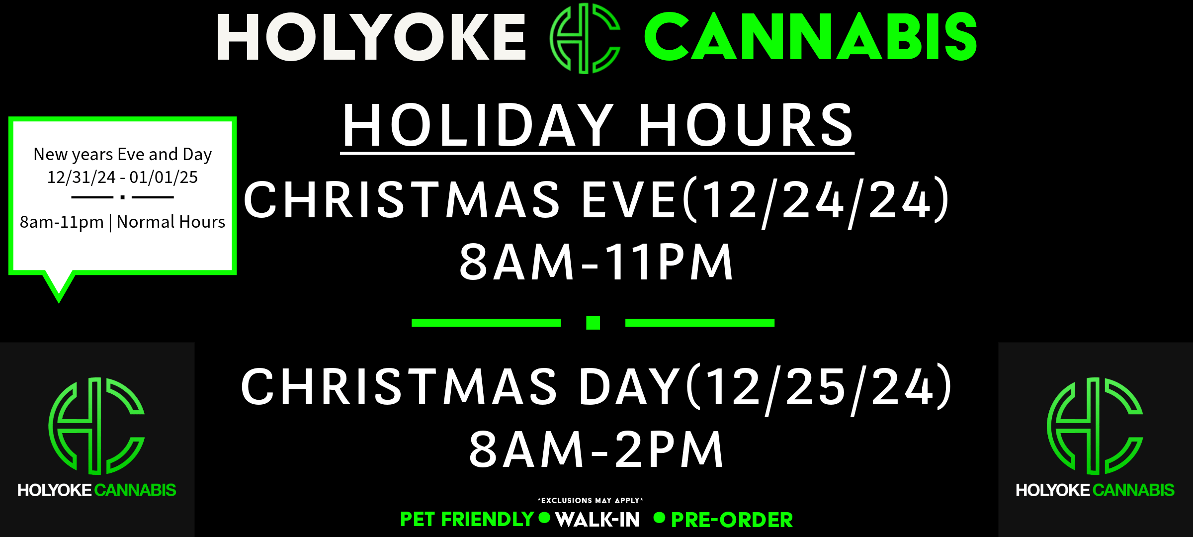 Holyoke Cannabis aplica una amplia gama de medidas sanitarias y de seguridad. La salud y la seguridad son prioritarias para sus clientes. "Desinfectamos constantemente el suelo y los mostradores y ofrecemos desinfectante de manos y mascarillas a todos los clientes", explica Jacob Black, director de marketing y adquisiciones de Holyoke Cannabis. "Los clientes también pueden hacer pedidos anticipados a través de nuestro sitio web www.holyokecannabis.com para reducir el tiempo que pasa en la tienda. Nos tomamos la seguridad de nuestros clientes muy en serio". Si tiene alguna pregunta o duda, por favor llame al 413-322-8611 y un Bud Tender de Holyoke Cannabis tendrá la respuesta que necesita.