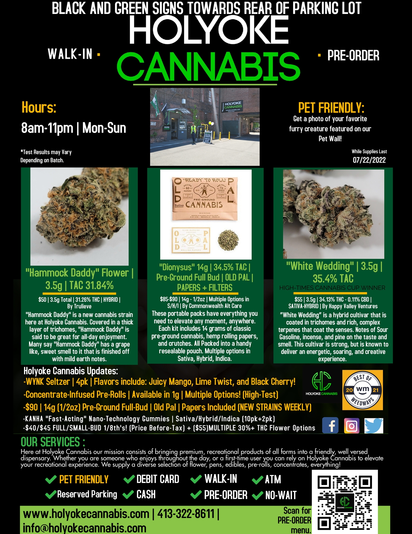 Holyoke Cannabis aplica una amplia gama de medidas sanitarias y de seguridad. La salud y la seguridad son prioritarias para sus clientes. "Desinfectamos constantemente el suelo y los mostradores y ofrecemos desinfectante de manos y mascarillas a todos los clientes", explica Jacob Black, director de marketing y adquisiciones de Holyoke Cannabis. "Los clientes también pueden hacer pedidos anticipados a través de nuestro sitio web www.holyokecannabis.com para reducir el tiempo que pasa en la tienda. Nos tomamos la seguridad de nuestros clientes muy en serio". Si tiene alguna pregunta o duda, por favor llame al 413-322-8611 y un Bud Tender de Holyoke Cannabis tendrá la respuesta que necesita.