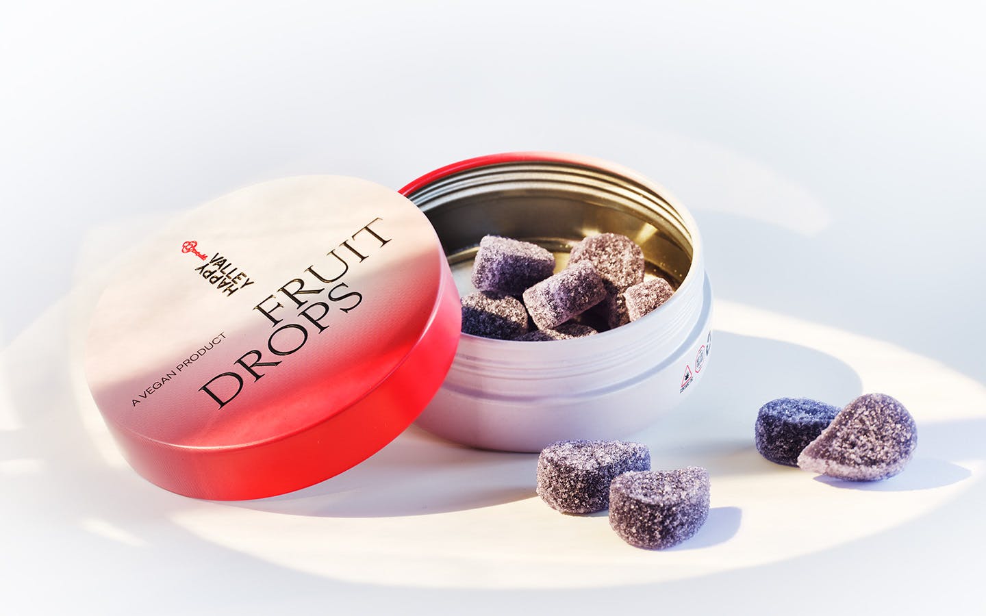 Valle Feliz Vegan Fruit Drops are made with hybrid distillate oil and organic ingredients. Each Happy Valley Vegan Fruit Drop has natural fruit juice and pectin instead of gelatin. Using pectin not only makes them vegan but it also ensures they won’t melt and provides for a soft bite. Inspired by the classic French jelly confection, Pâte de Fruit, which dates back to the 10th century. Even non-vegans will enjoy the great burst of fruit flavor of these Happy Valley Vegan Fruit Drops. These distillate gummies have a soft, silky texture sure to satisfy any sweet tooth. These vegan fruit drops are slightly larger than the non-vegan distillate gummies by Happy Valley.