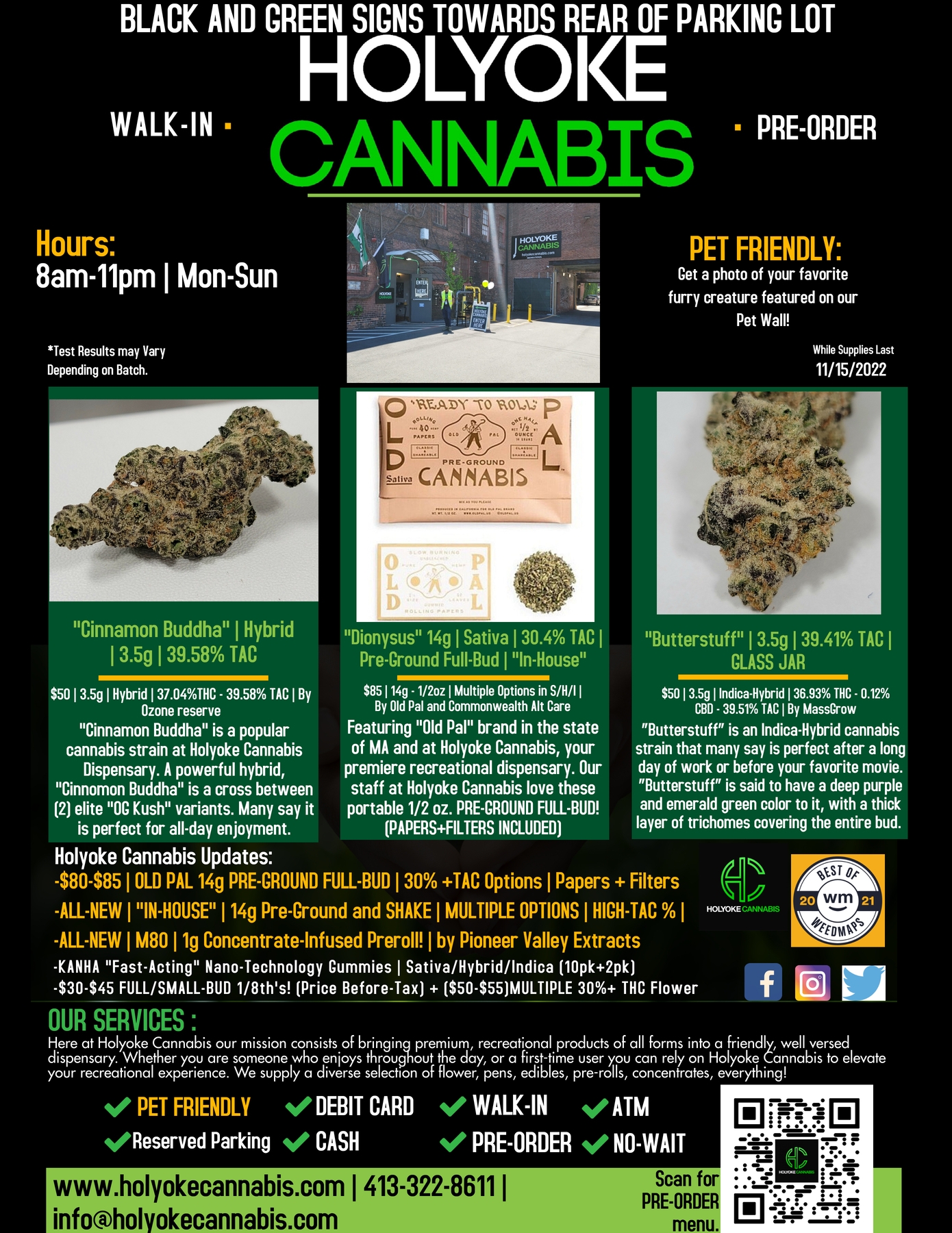 Sick and tired of those low-THC strains? Want a strain that has more THC than the inflation rate? Today we'll be highlighting some of our favorite "Heavy Hitters" including "Butterstuff" por MassGrow, "Cinnamon Buddha" por MassGrow y "Dionysus" pre-ground, full-bud bag por OLD PAL. If you're not really into flower, there's tons of concentrate options at Holyoke Cannabis Dispensary you can check out AQUÍ if you need even MORE THC (you monster)!