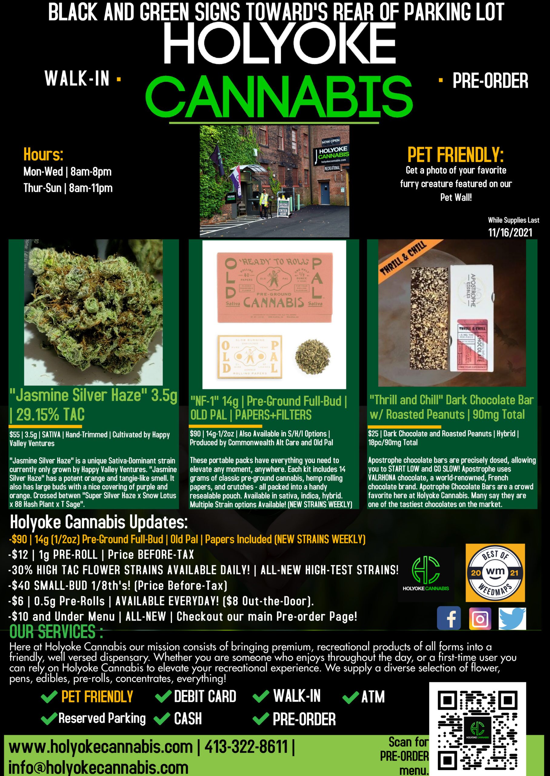 Holyoke Cannabis Dispensary 11/16/21: “Jasmine Silver Haze” Flower and the Apostrophe “Thrill and Chill” Dark-Chocolate Bar w/ Roasted Peanuts