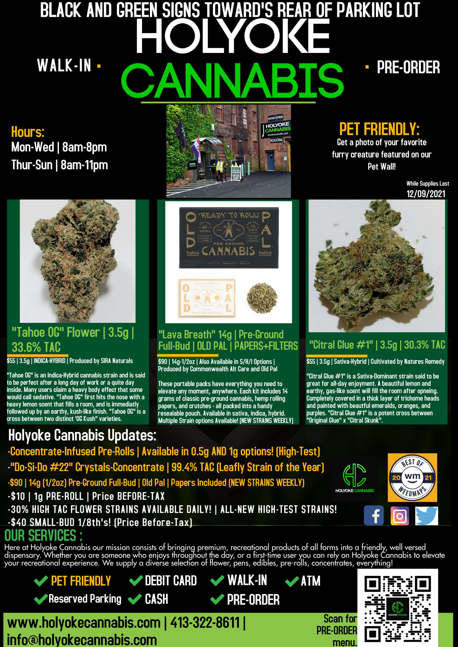 Holyoke Cannabis aplica una amplia gama de medidas sanitarias y de seguridad. La salud y la seguridad son prioritarias para sus clientes. "Desinfectamos constantemente el suelo y los mostradores y ofrecemos desinfectante de manos y mascarillas a todos los clientes", explica Jacob Black, director de marketing y adquisiciones de Holyoke Cannabis. "Los clientes también pueden hacer pedidos anticipados a través de nuestro sitio web www.holyokecannabis.com para reducir el tiempo que pasa en la tienda. Nos tomamos la seguridad de nuestros clientes muy en serio". Si tiene alguna pregunta o duda, por favor llame al 413-322-8611 y un Bud Tender de Holyoke Cannabis tendrá la respuesta que necesita.