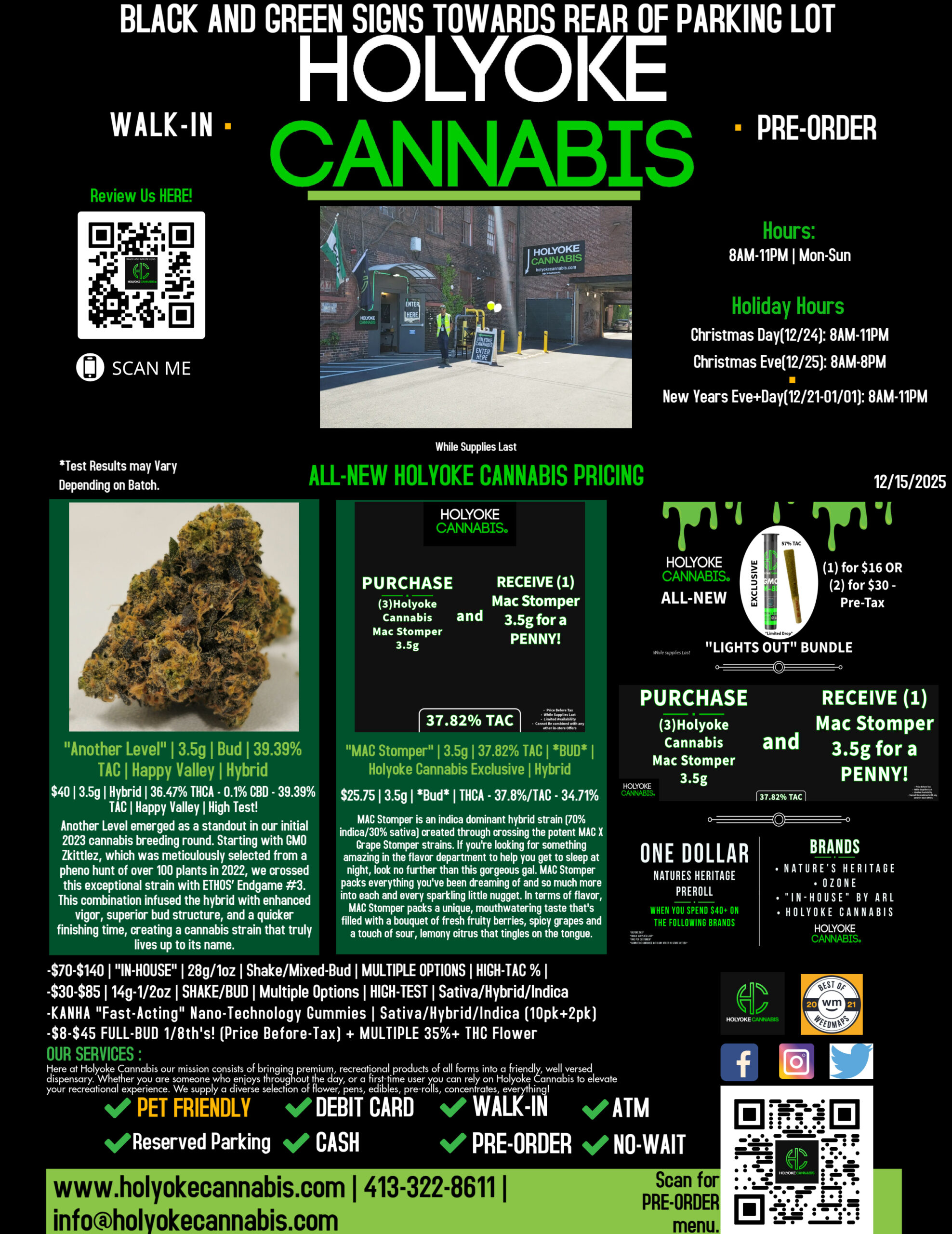 What’s good Holyoke Cannabis tokers? Today we’ll be highlighting some of our favorite brands and products including “Another Level” 3.5g Premium Bud Flower by Happy Valley, “Mac Stomper” 3.5g *BUD* by Holyoke Cannabis, and, Holyoke Cannabis Exclusive Bundle Updates If you’re not really into flower, there’s tons of concentrate options at Holyoke Cannabis Dispensary you can check out HERE.