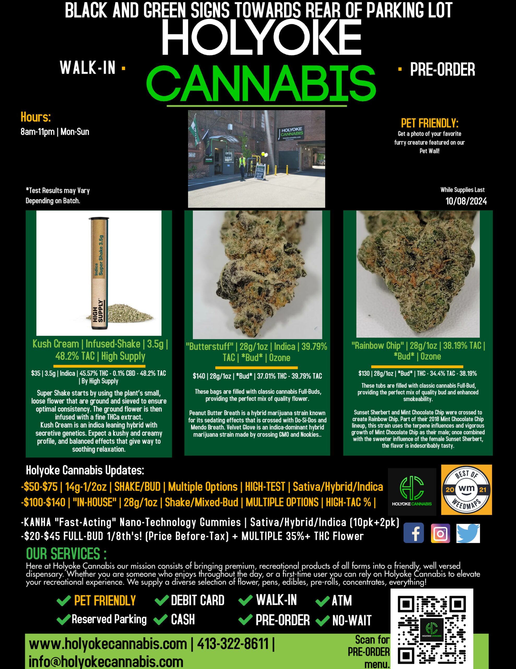 What’s good Holyoke Cannabis stoners? Today we’ll be highlighting the amazing “IN-HOUSE” 28g/1oz – 14g – 7g Bud/Pre-Ground (~HIGH-TEST~) with Holyoke Cannabis Dispensary. 28g/1oz Full-bud not your thing? We have a TON of flower, edible, and other options at Holyoke Cannabis Dispensary you can check out HERE.