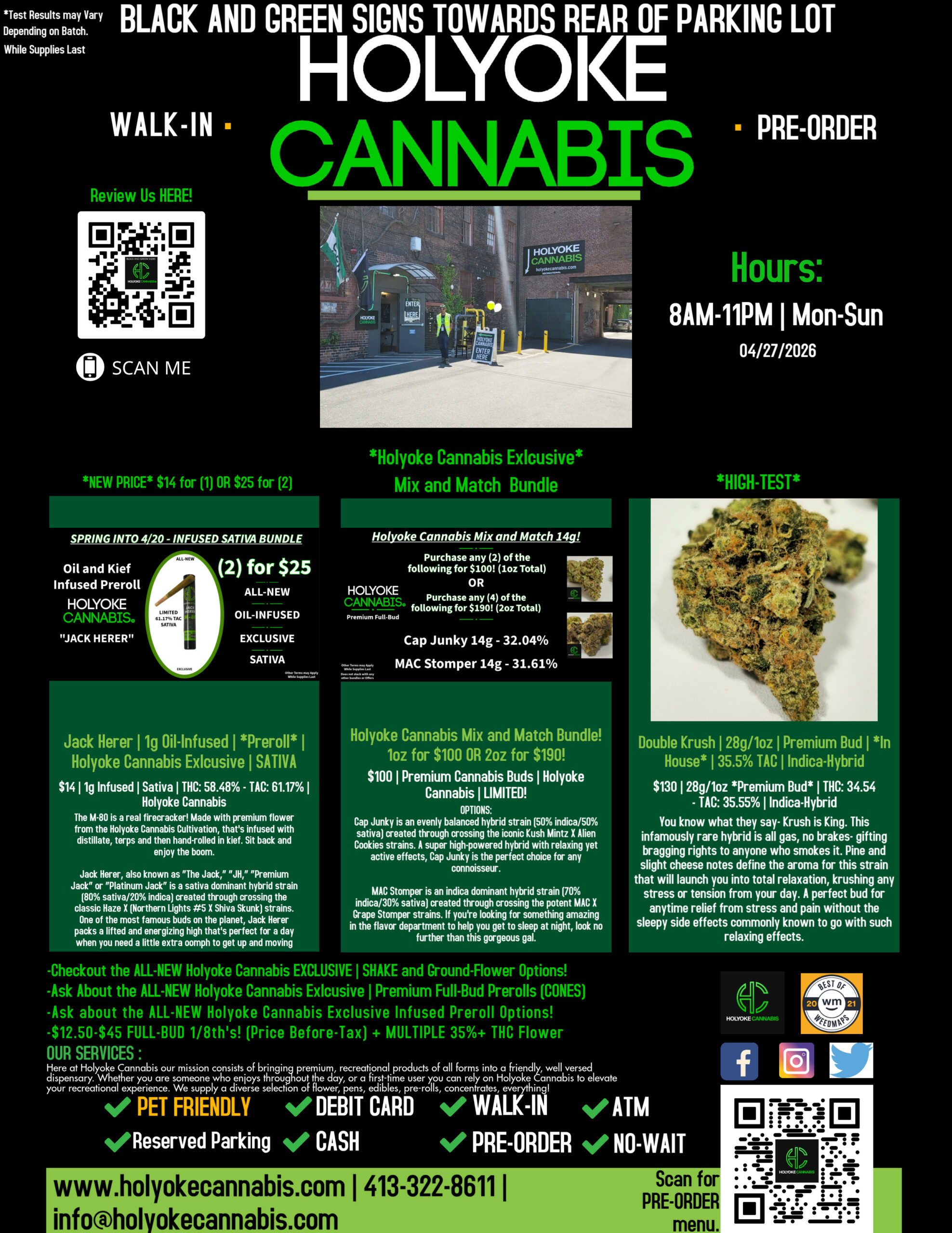 Here at Holyoke Cannabis our mission consists of bringing premium, recreational products of all forms into a friendly, well versed dispensary. Whether you are someone who enjoys throughout the day, or a first-time user you can rely on Holyoke Cannabis to elevate your recreational experience. We supply a diverse selection of flower, pens, edibles, pre-rolls, concentrates, everything!