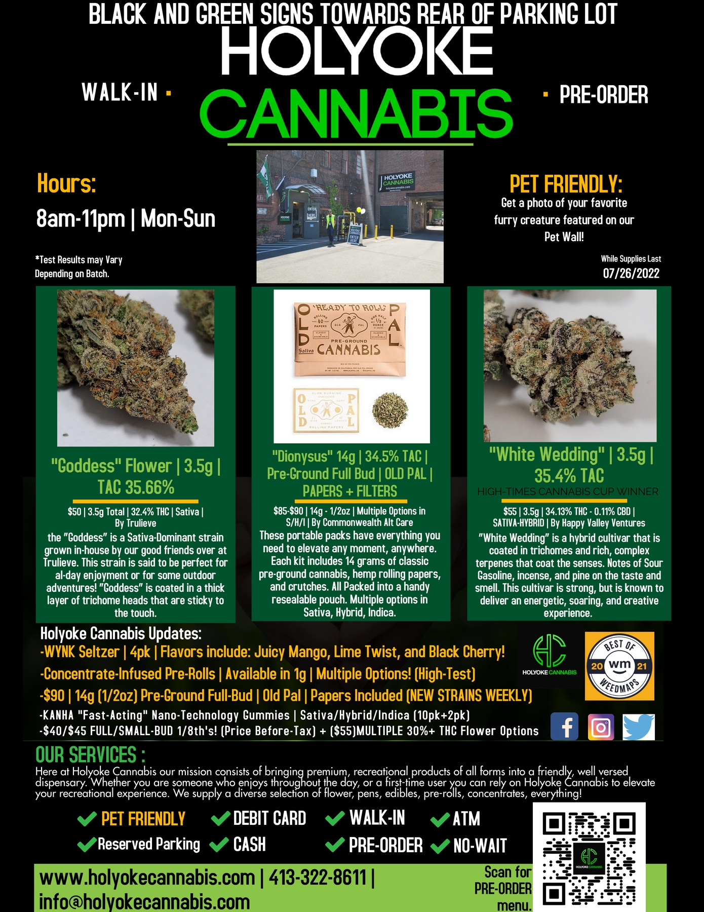 Holyoke Cannabis aplica una amplia gama de medidas sanitarias y de seguridad. La salud y la seguridad son prioritarias para sus clientes. "Desinfectamos constantemente el suelo y los mostradores y ofrecemos desinfectante de manos y mascarillas a todos los clientes", explica Jacob Black, director de marketing y adquisiciones de Holyoke Cannabis. "Los clientes también pueden hacer pedidos anticipados a través de nuestro sitio web www.holyokecannabis.com para reducir el tiempo que pasa en la tienda. Nos tomamos la seguridad de nuestros clientes muy en serio". Si tiene alguna pregunta o duda, por favor llame al 413-322-8611 y un Bud Tender de Holyoke Cannabis tendrá la respuesta que necesita.
