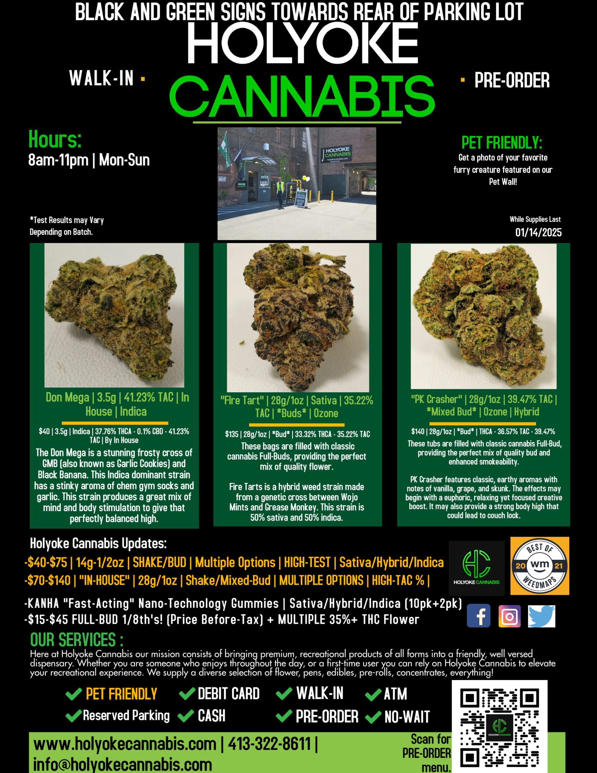 Holyoke Cannabis aplica una amplia gama de medidas sanitarias y de seguridad. La salud y la seguridad son prioritarias para sus clientes. "Desinfectamos constantemente el suelo y los mostradores y ofrecemos desinfectante de manos y mascarillas a todos los clientes", explica Jacob Black, director de marketing y adquisiciones de Holyoke Cannabis. "Los clientes también pueden hacer pedidos anticipados a través de nuestro sitio web www.holyokecannabis.com para reducir el tiempo que pasa en la tienda. Nos tomamos la seguridad de nuestros clientes muy en serio". Si tiene alguna pregunta o duda, por favor llame al 413-322-8611 y un Bud Tender de Holyoke Cannabis tendrá la respuesta que necesita.
