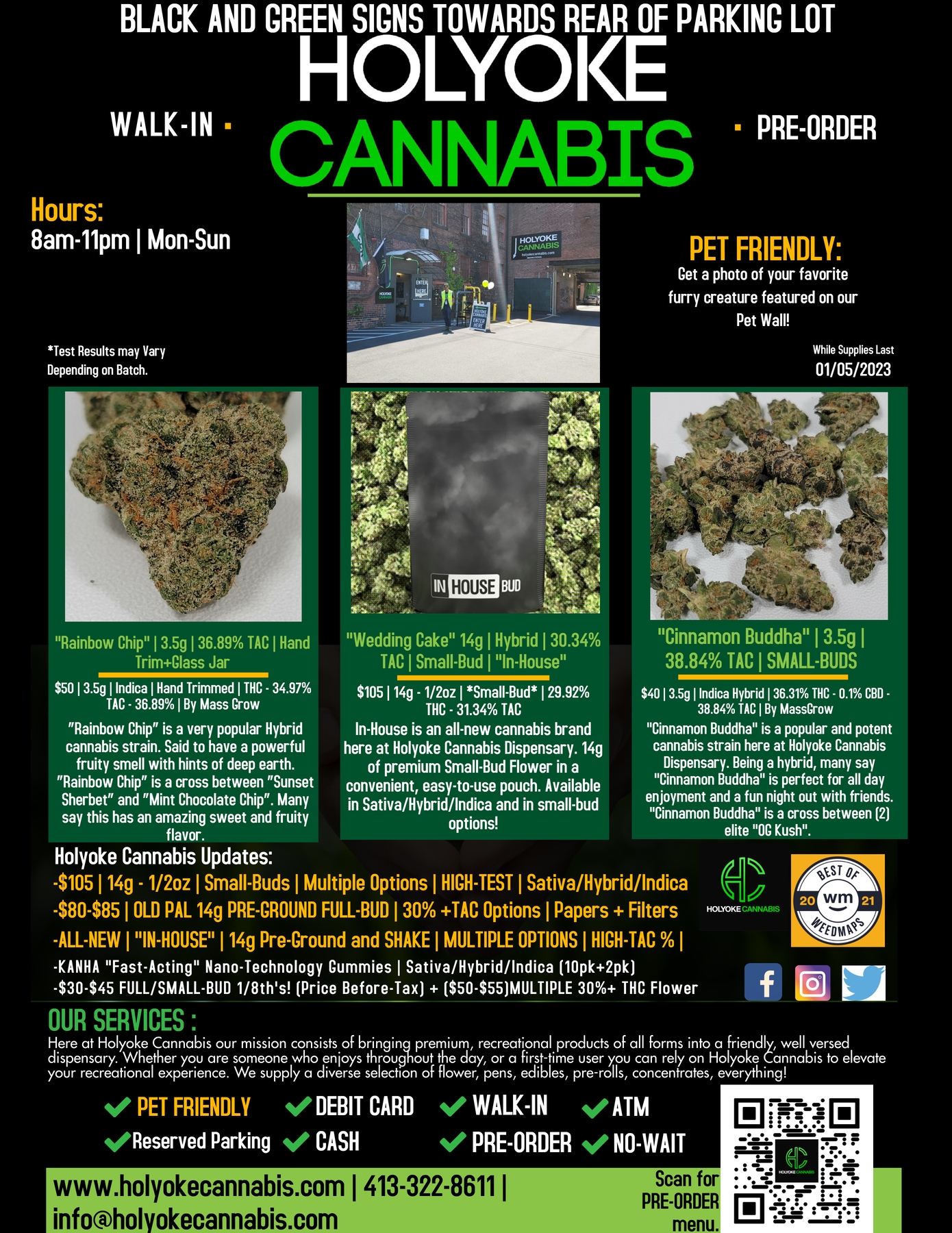 Holyoke Cannabis aplica una amplia gama de medidas sanitarias y de seguridad. La salud y la seguridad son prioritarias para sus clientes. "Desinfectamos constantemente el suelo y los mostradores y ofrecemos desinfectante de manos y mascarillas a todos los clientes", explica Jacob Black, director de marketing y adquisiciones de Holyoke Cannabis. "Los clientes también pueden hacer pedidos anticipados a través de nuestro sitio web www.holyokecannabis.com para reducir el tiempo que pasa en la tienda. Nos tomamos la seguridad de nuestros clientes muy en serio". Si tiene alguna pregunta o duda, por favor llame al 413-322-8611 y un Bud Tender de Holyoke Cannabis tendrá la respuesta que necesita.