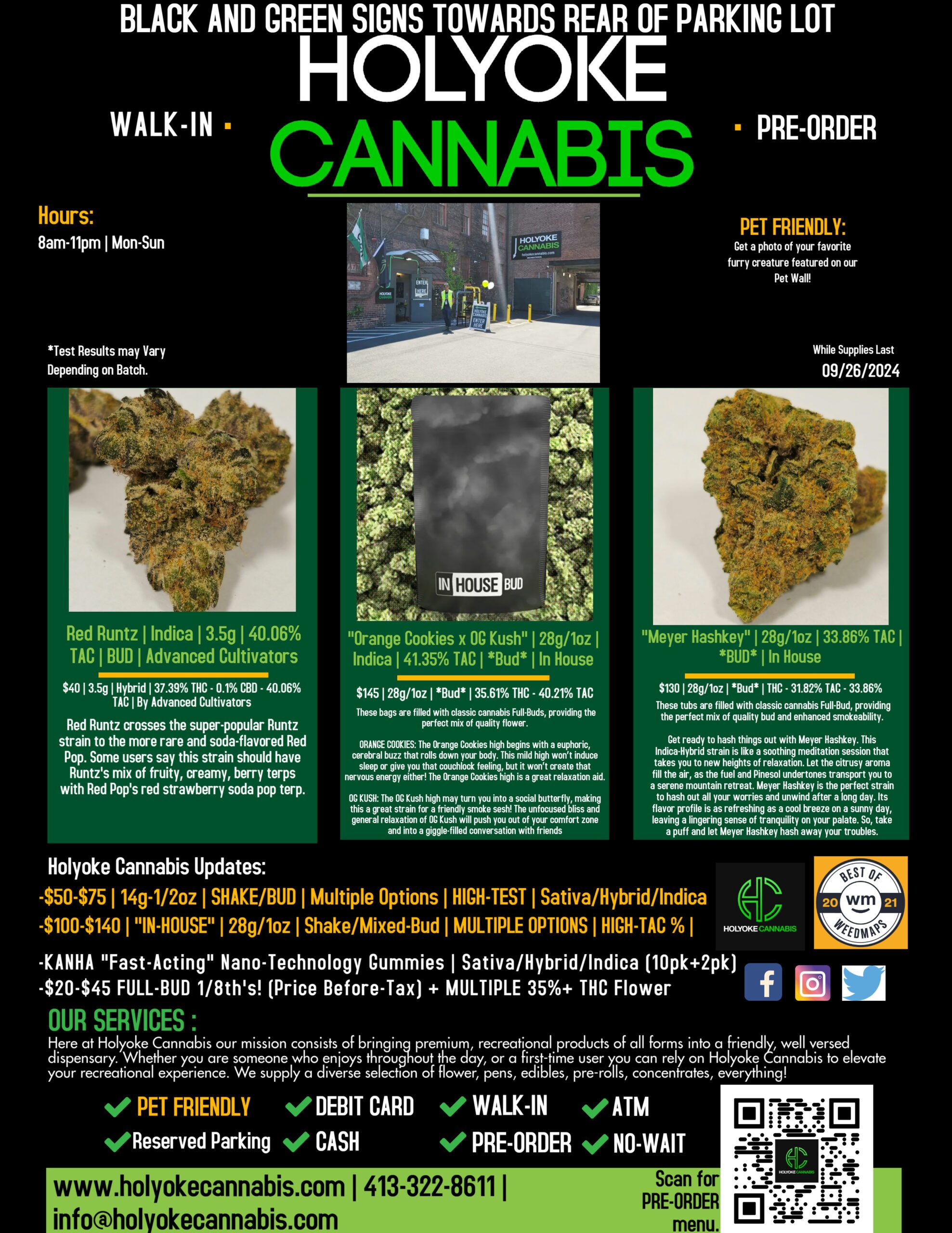 Holyoke Cannabis aplica una amplia gama de medidas sanitarias y de seguridad. La salud y la seguridad son prioritarias para sus clientes. "Desinfectamos constantemente el suelo y los mostradores y ofrecemos desinfectante de manos y mascarillas a todos los clientes", explica Jacob Black, director de marketing y adquisiciones de Holyoke Cannabis. "Los clientes también pueden hacer pedidos anticipados a través de nuestro sitio web www.holyokecannabis.com para reducir el tiempo que pasa en la tienda. Nos tomamos la seguridad de nuestros clientes muy en serio". Si tiene alguna pregunta o duda, por favor llame al 413-322-8611 y un Bud Tender de Holyoke Cannabis tendrá la respuesta que necesita.