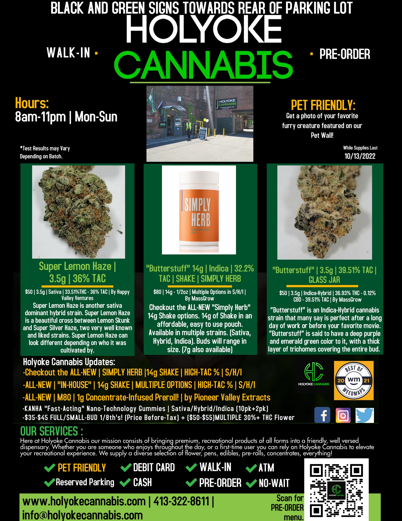 Holyoke Cannabis aplica una amplia gama de medidas sanitarias y de seguridad. La salud y la seguridad son prioritarias para sus clientes. "Desinfectamos constantemente el suelo y los mostradores y ofrecemos desinfectante de manos y mascarillas a todos los clientes", explica Jacob Black, director de marketing y adquisiciones de Holyoke Cannabis. "Los clientes también pueden hacer pedidos anticipados a través de nuestro sitio web www.holyokecannabis.com para reducir el tiempo que pasa en la tienda. Nos tomamos la seguridad de nuestros clientes muy en serio". Si tiene alguna pregunta o duda, por favor llame al 413-322-8611 y un Bud Tender de Holyoke Cannabis tendrá la respuesta que necesita.