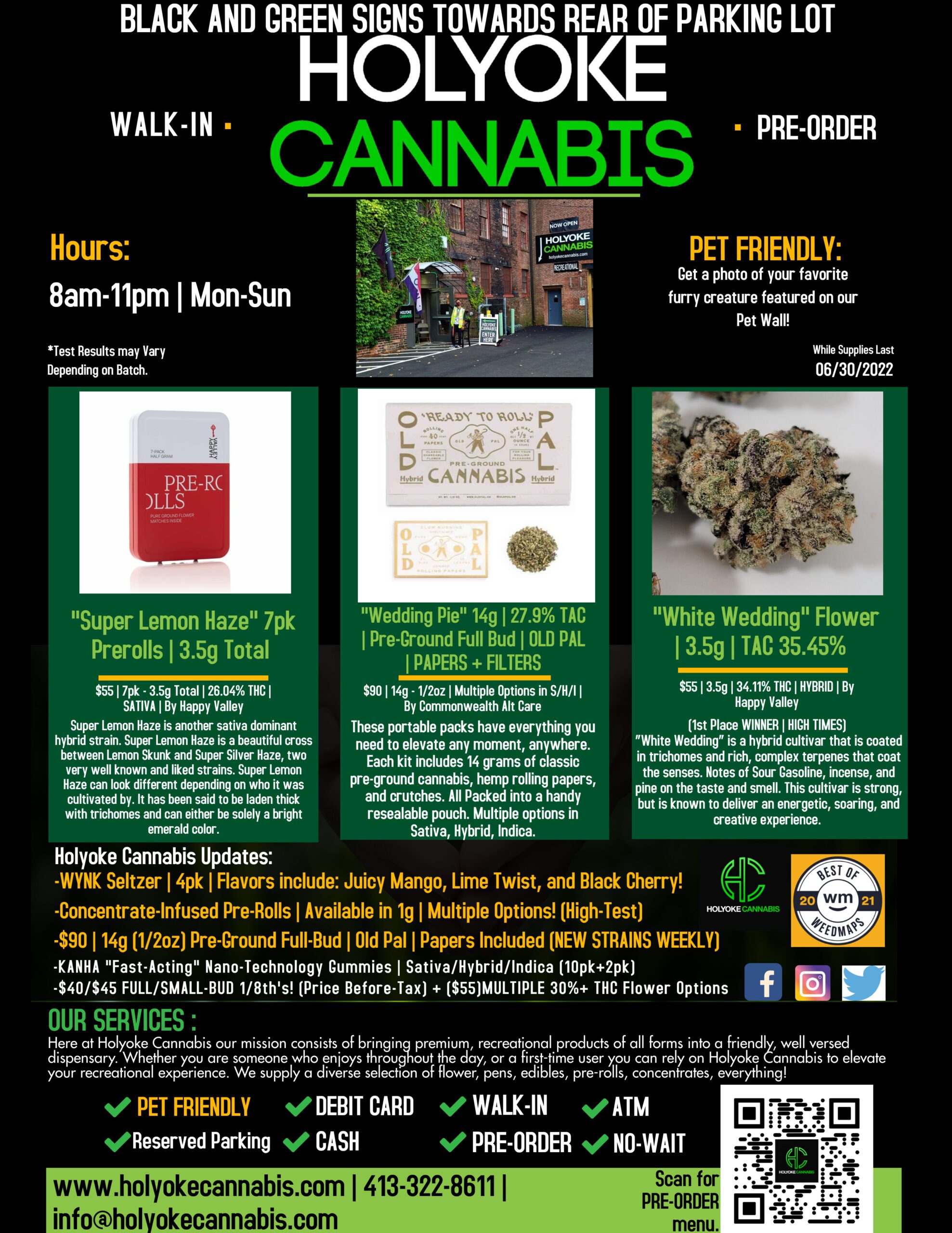 ¿Qué es bueno para los fumetas de Holyoke Cannabis? Hoy vamos a destacar algunas de nuestras marcas y productos favoritos, incluyendo “Super Lemon Haze” Pre-Roll 7 Packs por Happy Valley, “White Wedding” Flower (1st Place High-Times Winner) por Valle Felizy “Wedding Pie” 14g by Old Pal! If you’re not really into flower, there’s tons of concentrate options at Holyoke Cannabis Dispensary you can check out AQUÍ.
