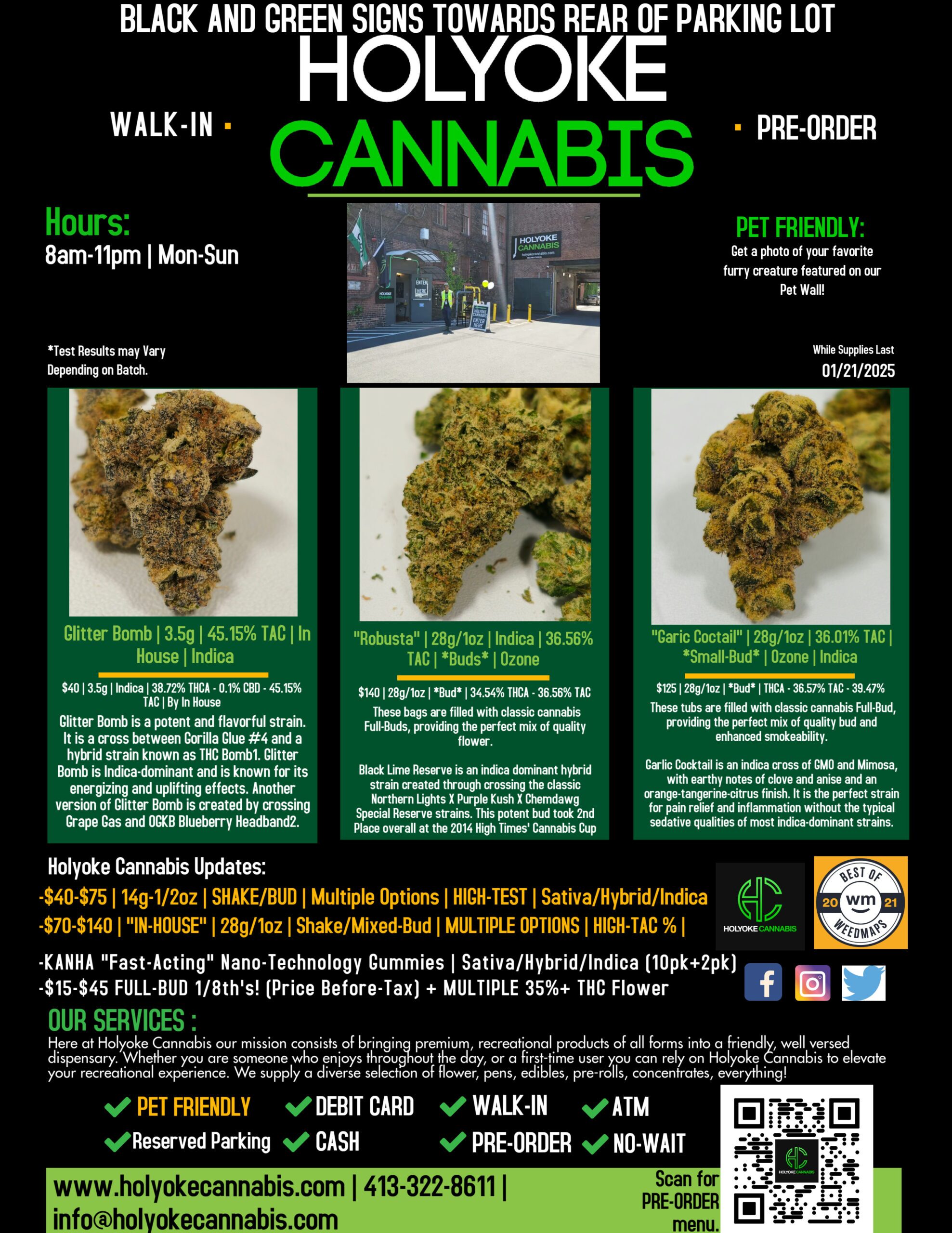 What’s good Holyoke Cannabis tokers? Today we’ll be highlighting some of our favorite brands and products including “Glitter Bomb” Flower by In House, “Robusta” 28g/1oz *Bud* by Ozone and “Garlic Cocktail” 28g/1oz *Small-Bud* by Ozone. If you’re not really into flower, there’s tons of concentrate options at Holyoke Cannabis Dispensary you can check out HERE.