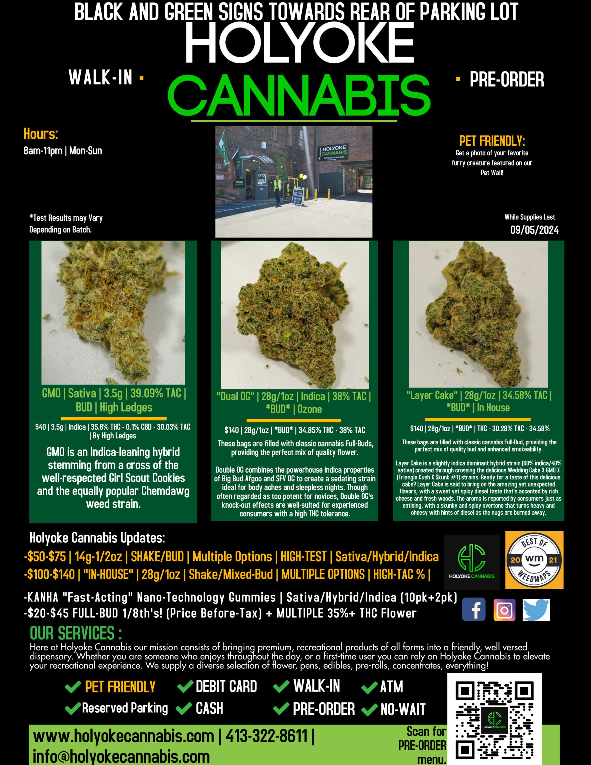 What’s good Holyoke Cannabis tokers? Today we’ll be highlighting some of our favorite brands and products including “GMO” Flower by High Ledges. “Dual OG” 28g/1oz *BUD* by Ozone and “Layer Cake” 28g/1oz *BUD* by In House. If you’re not really into flower, there’s tons of concentrate options at Holyoke Cannabis Dispensary you can check out HERE.