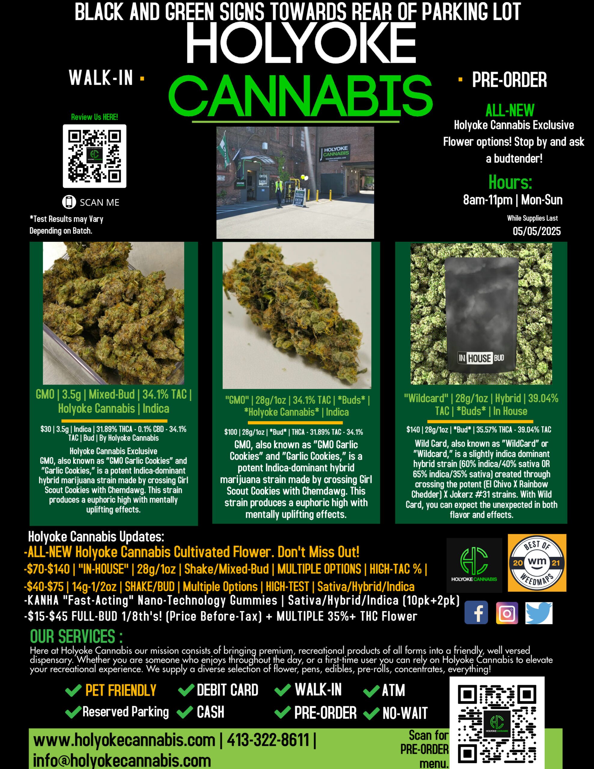 What’s good Holyoke Cannabis tokers? Today we’ll be highlighting some of our favorite brands and products including “GMO” 3.5g Mixed-Bud Flower by Holyoke Cannabis(Exclusive), In House “Wildcard” 28g/1oz *Bud* by In House/ARL and “GMO” 28g/1oz *BUD* by Holyoke Cannabis Premium Flower! If you’re not really into flower, there’s tons of concentrate options at Holyoke Cannabis Dispensary you can check out HERE.