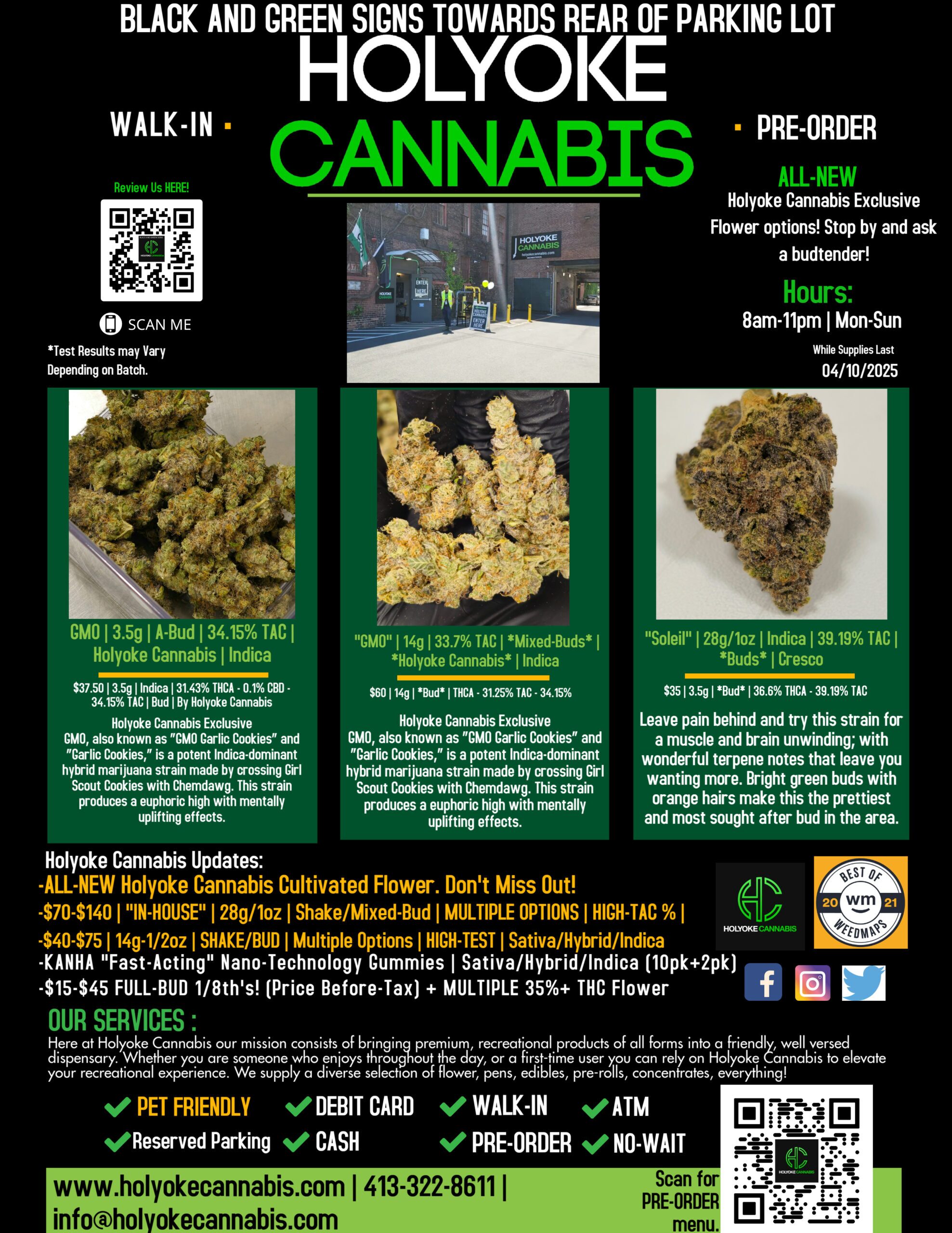 What’s good Holyoke Cannabis tokers? Today we’ll be highlighting some of our favorite brands and products including “GMO” 3.5g Premium Flower by Holyoke Cannabis(Exclusive), “GMO” 14g *Bud* by Holyoke Cannabis(Exclusive) and Soleil” Flower by Cresco! If you’re not really into flower, there’s tons of concentrate options at Holyoke Cannabis Dispensary you can check out HERE.