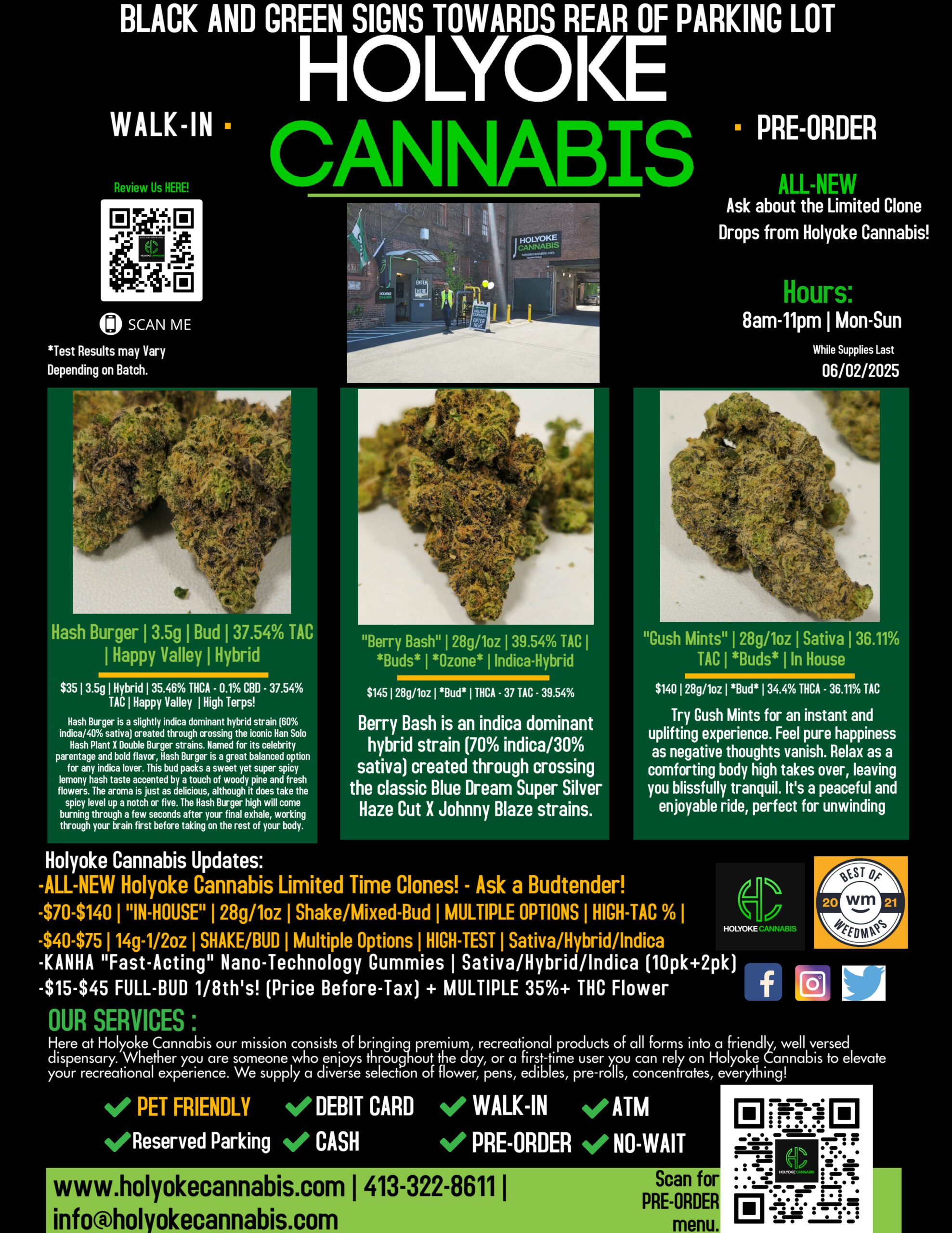 What’s good Holyoke Cannabis tokers? Today we’ll be highlighting some of our favorite brands and products including “Hash Burger” 3.5g Bud Flower by Happy Valley, In-House “Gush Mints” 28g/1oz *Bud* by ARL/Natures Heritage and, “Berry Bash” 28g/1oz *BUD* by Ozone. If you’re not really into flower, there’s tons of concentrate options at Holyoke Cannabis Dispensary you can check out HERE.