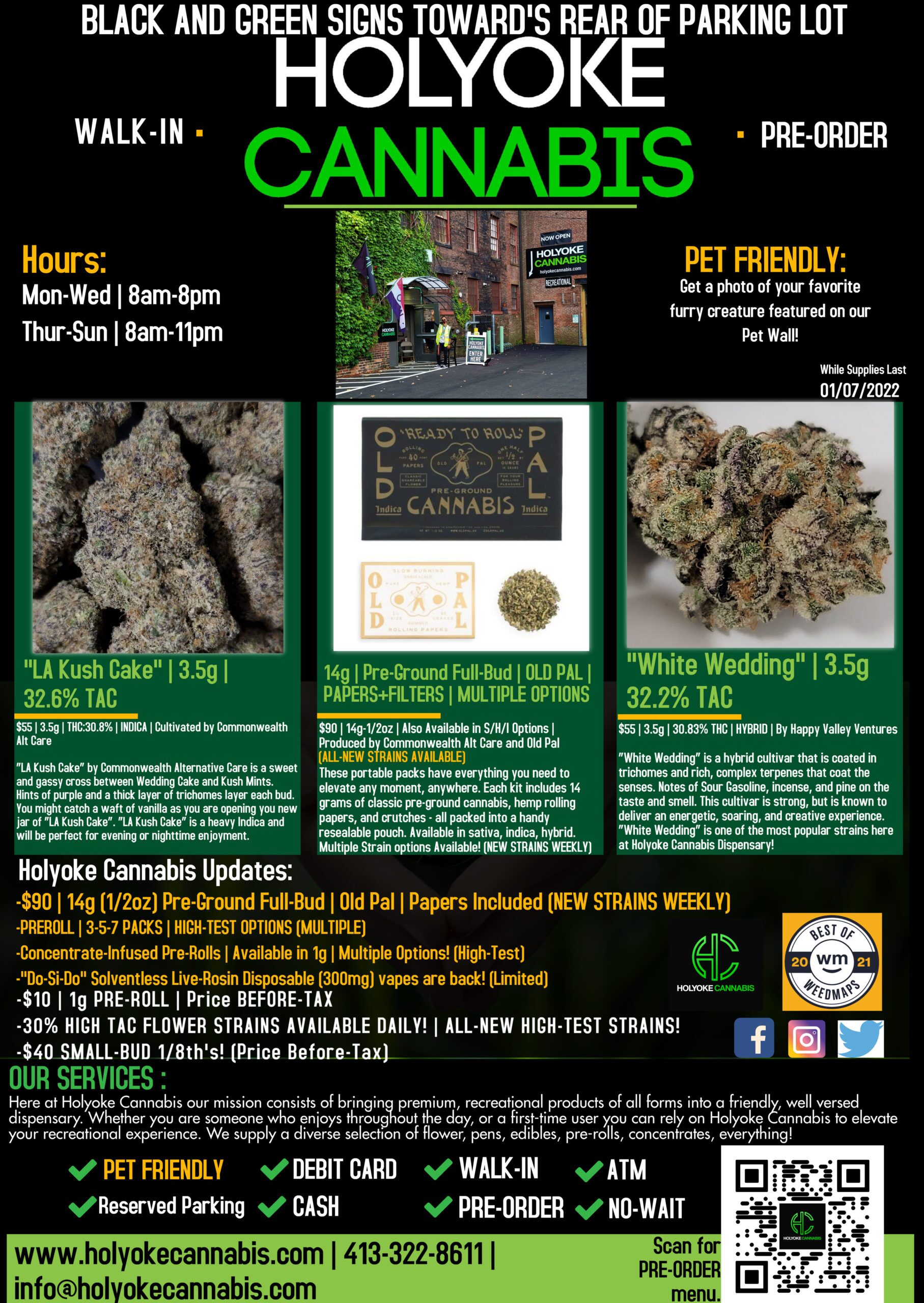 Holyoke Cannabis Dispensary 01/07/21: “LA Kush Cake” Flower (High-Test) | ALL-NEW “Old Pal” Pre-Ground Full-Bud Options | “White Wedding” Flower (High-Test)