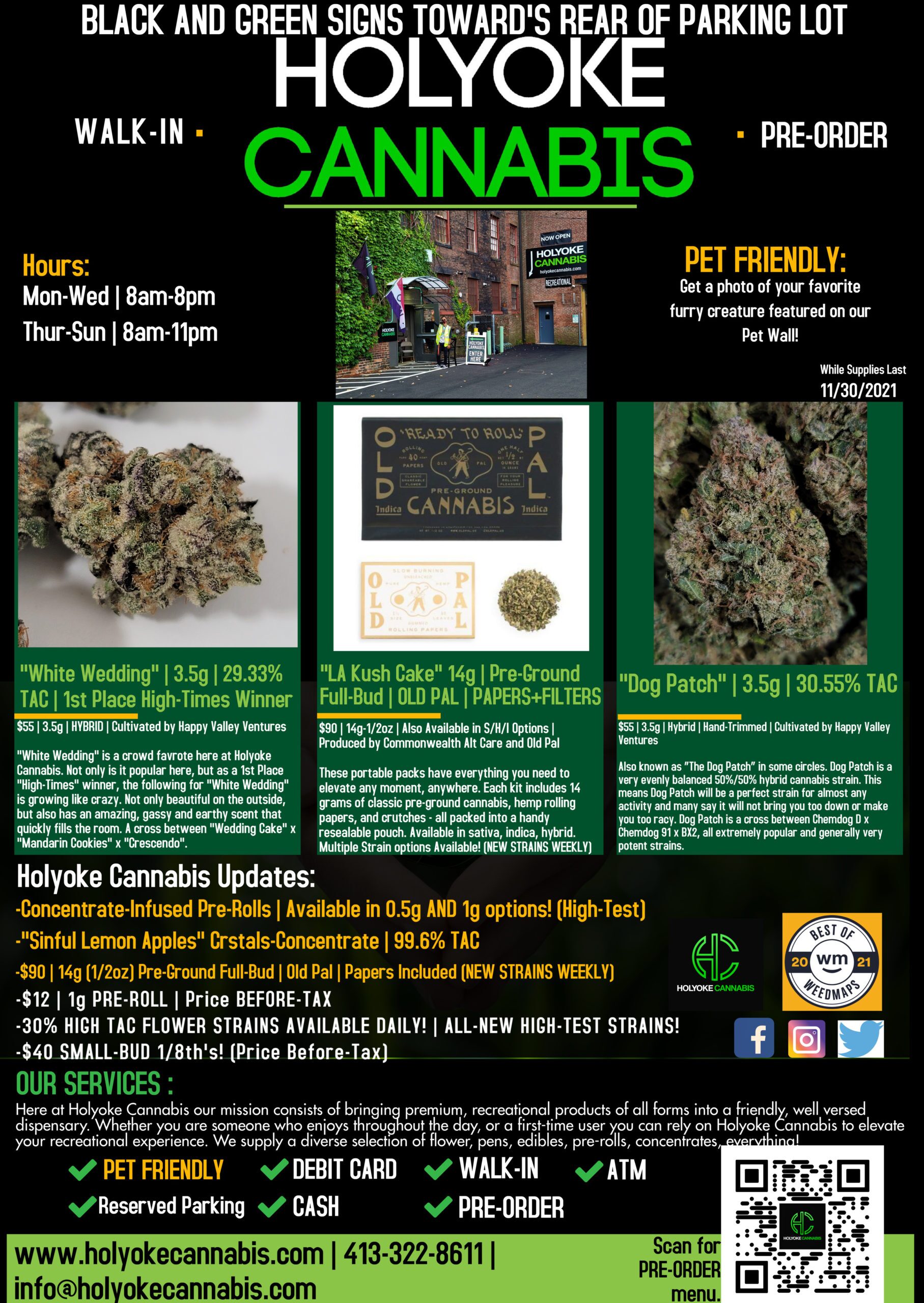 Holyoke Cannabis Dispensary 11/30/21: “White Wedding” Flower – 1st Place WINNER in the High-Times Cup and “Dog Patch” High-Test Flower