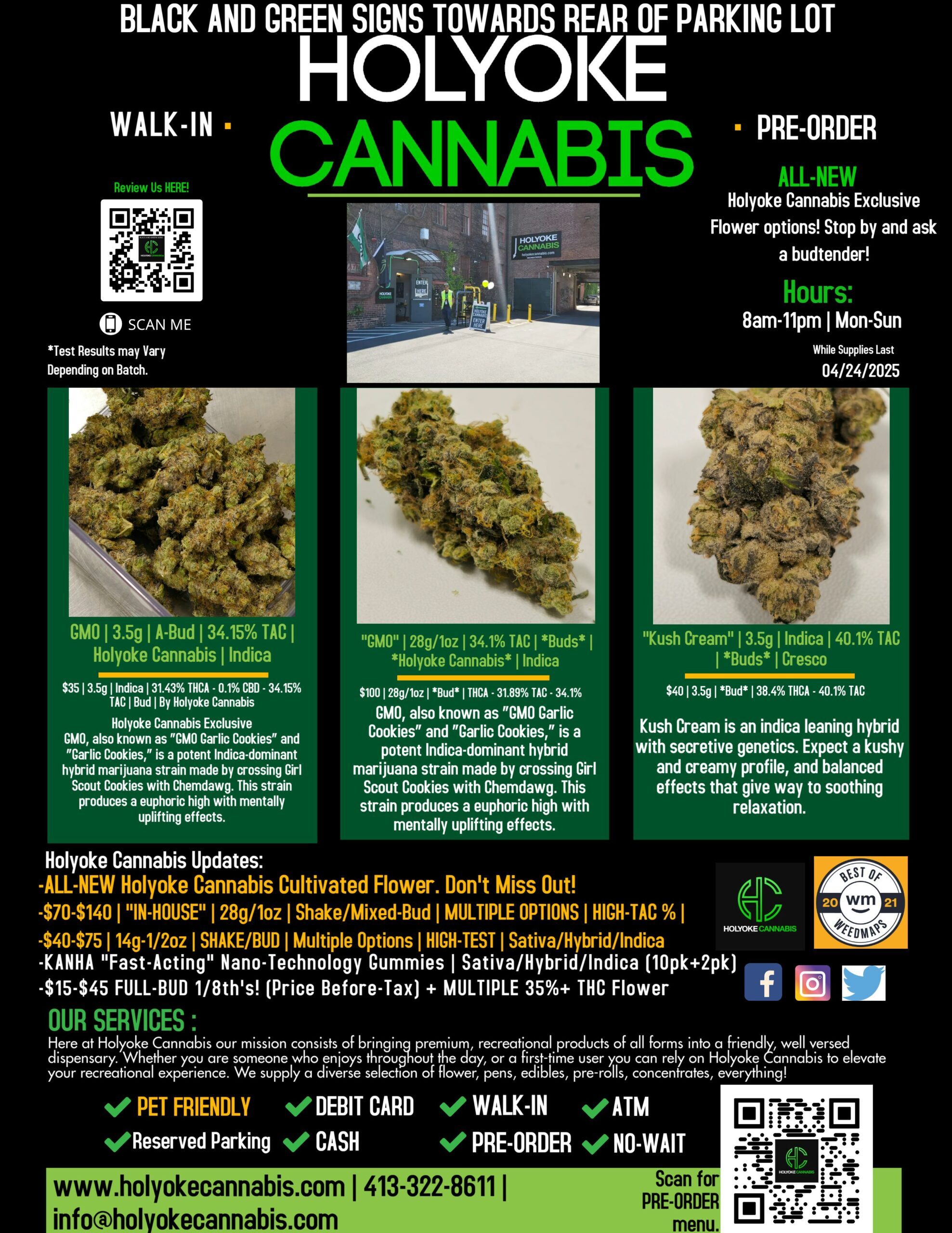 What’s good Holyoke Cannabis stoners? Today we’ll be highlighting the amazing “IN-HOUSE” 28g/1oz – 14g – 7g Bud(~HIGH-TEST~) with Holyoke Cannabis Dispensary. 28g/1oz Full-bud not your thing? We have a TON of flower, edible, and other options at Holyoke Cannabis Dispensary you can check out HERE.