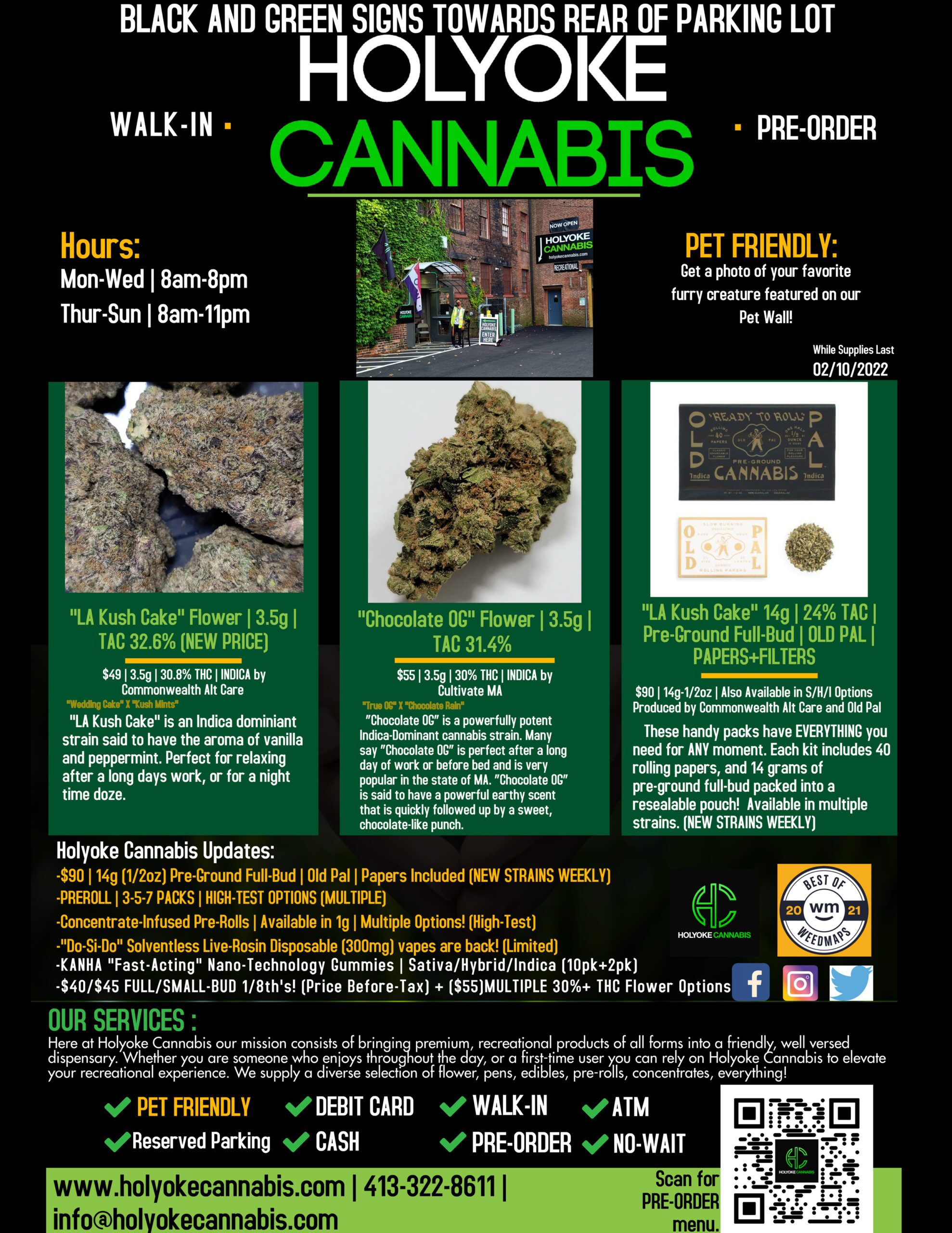 This week we explore a few of Holyoke Cannabis’s own budtender’s favorite picks: LA Kush Cake Bud (32.6% TAC – NEW PRICE) from Commonwealth Alt Care, NEW “LA Kush Cake” Pre-Ground Pouches by Old Pal, and Chocolate OG Bud (31.4% TAC) by Cultivate MA.