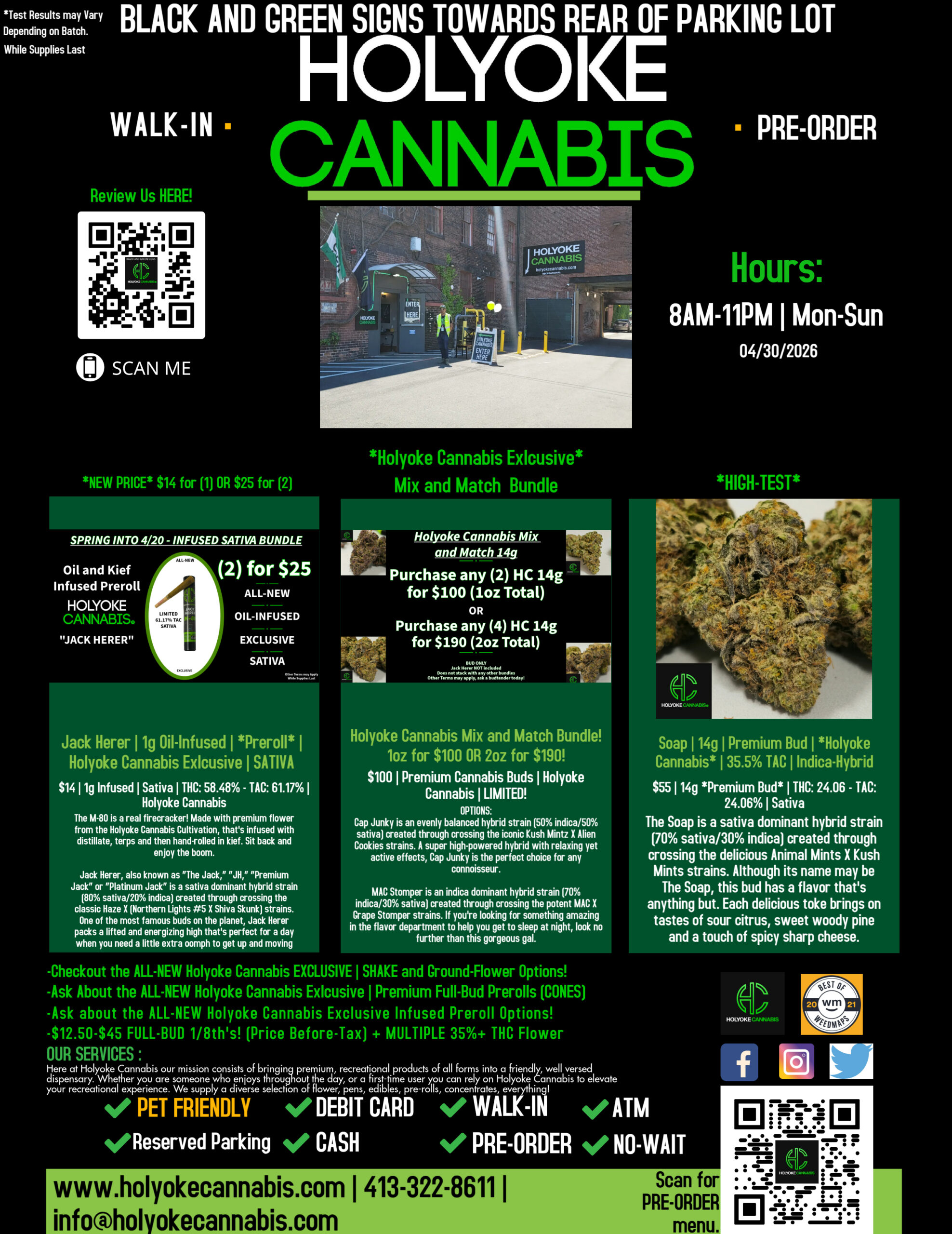 What’s good Holyoke Cannabis tokers? Today we’ll be highlighting some of our favorite brands and products including(NEW) HC “Jack Herer” 1g M80 Infused Preroll – 61.17% TAC by Holyoke Cannabis, ALL-NEW Mix and Match HC 14g Bundle! by Holyoke Cannabis, and, Holyoke Cannabis, and “Soap” 14g *BUD* by Holyoke Cannabis If you’re not really into flower, there’s tons of concentrate options at Holyoke Cannabis Dispensary you can check out HERE.