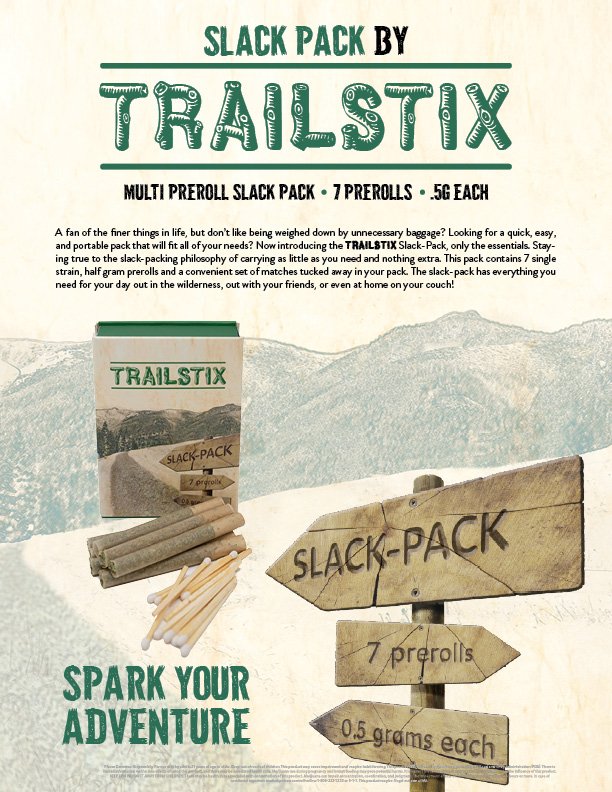 A fan of the finer things in life, but don’t like being weighed down by unnecessary baggage? Looking for a quick, easy, and portable pack that will fit all of your needs? Now introducing the TrailStix Slack-Pack, only the essentials. Staying true to the slack-packing philosophy of carrying as little as you need and nothing extra. This pack contains 7 single strain, half gram prerolls and a convenient set of matches tucked away in your pack. The slack-pack has everything you need for your day out in the wilderness, out with your friends, or even at home on your couch!