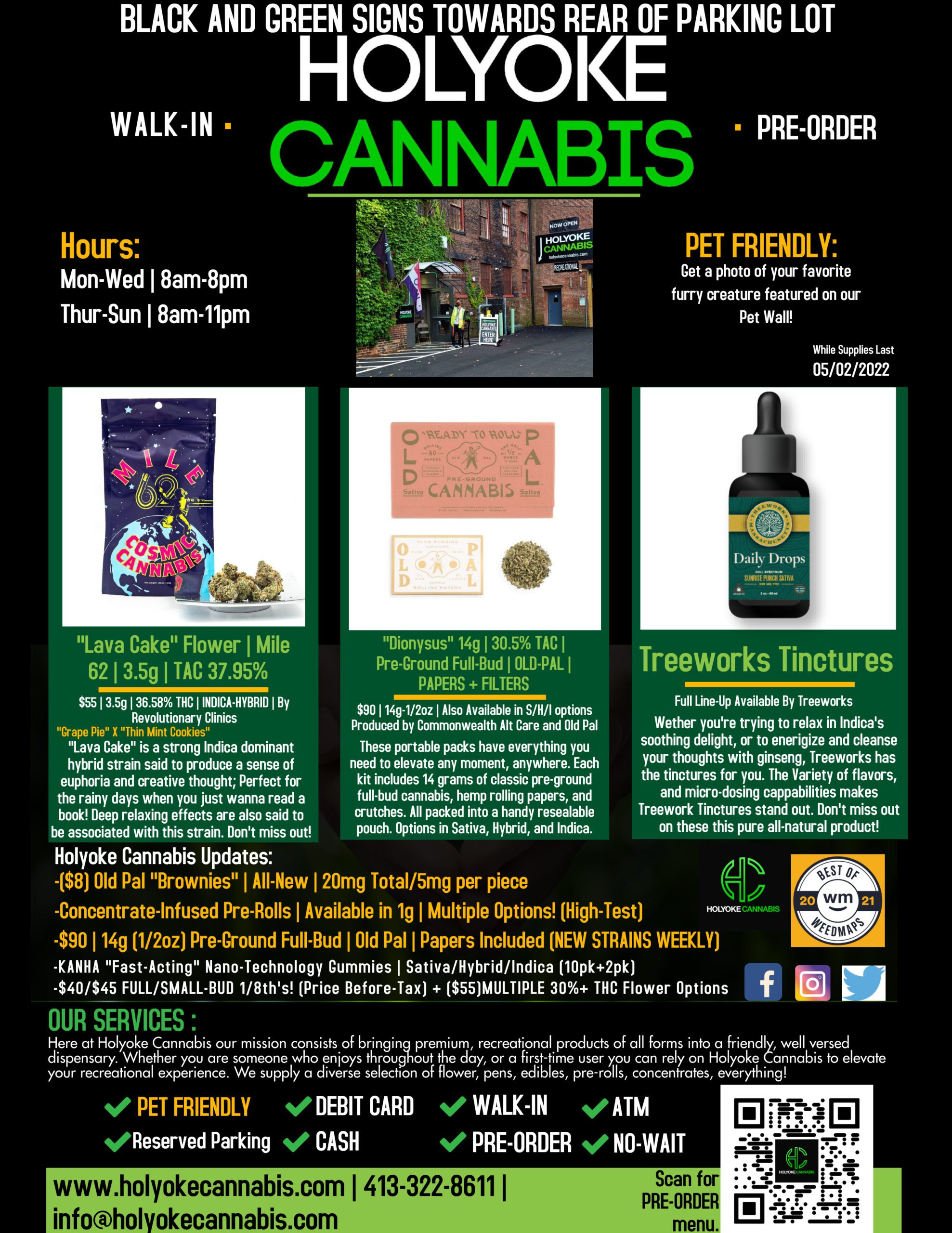 What’s good Holyoke Cannabis stoners? Today we’re highlighting some amazing flower and brands! Our highlights today are Lava Cake #11 by Mile 62 and Revolutionary Clinics, Dionysus by the ever trusty people at Old Pal, and our full line-up of Tinctures by Treeworks. All three of these items are top tier.