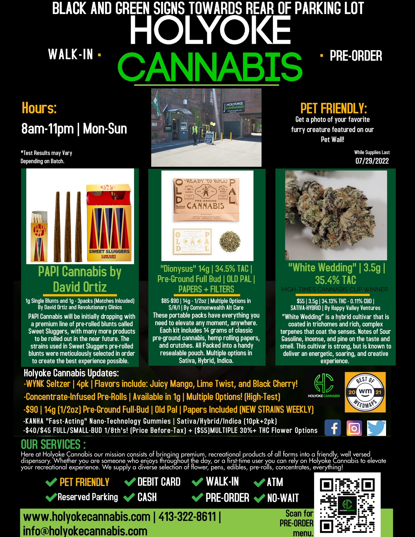 Holyoke Cannabis implements a wide range of sanitation and safety measures. Health and security are major priorities for their walk-in customers. “We are constantly sanitizing our sales floor and counterspace and offer both hand sanitizer and masks to all customers.” explains Jacob Black, Marketing and procurement Manager for Holyoke Cannabis. “Customers can also pre-order through our website www.holyokecannabis.com in order to decrease your time spent in store. We take our customers safety concerns extremely seriously.”. If you have any questions or concerns, please call 413-322-8611 and a Holyoke Cannabis Bud Tender will have the answer you need.