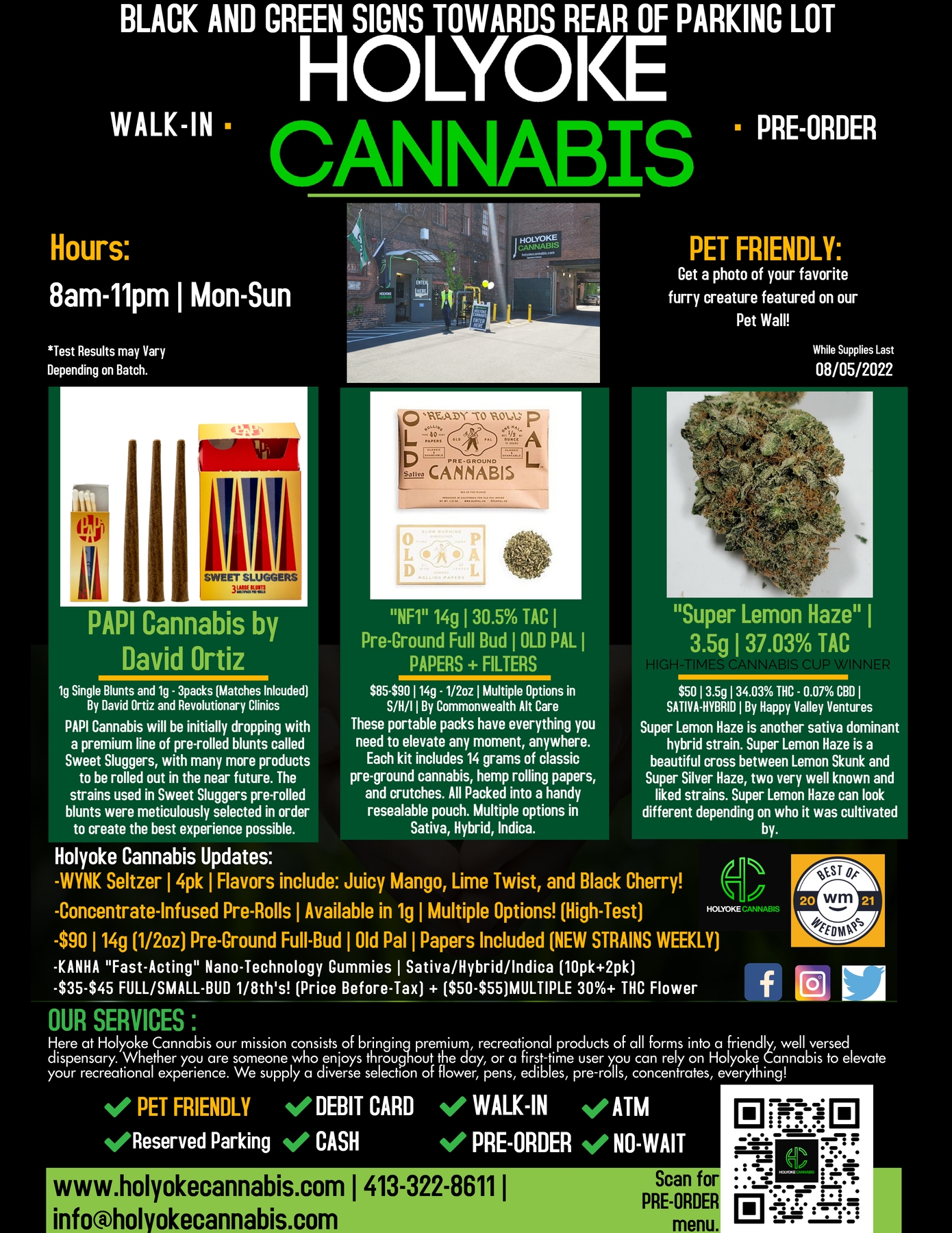 What’s good Holyoke Cannabis stoners? Today we’ll be highlighting some of our favorite brands and products including “PAPI Cannabis” Sweet Sluggers Pre-rolled Blunts by David Ortiz and Rev Clinics, “Super Lemon Haze” Flower by Happy Valley, and “LA Kush Cake” 14g by Old Pal! If you’re not really into flower, there’s tons of concentrate options at Holyoke Cannabis Dispensary you can check out HERE.