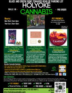 Holyoke Cannabis implements a wide range of sanitation and safety measures. Health and security are major priorities for their walk-in customers. “We are constantly sanitizing our sales floor and counterspace and offer both hand sanitizer and masks to all customers.” explains Jacob Black, Marketing and procurement Manager for Holyoke Cannabis. “Customers can also pre-order through our website www.holyokecannabis.com in order to decrease your time spent in store. We take our customers safety concerns extremely seriously.”. If you have any questions or concerns, please call 413-322-8611 and a Holyoke Cannabis Bud Tender will have the answer you need.