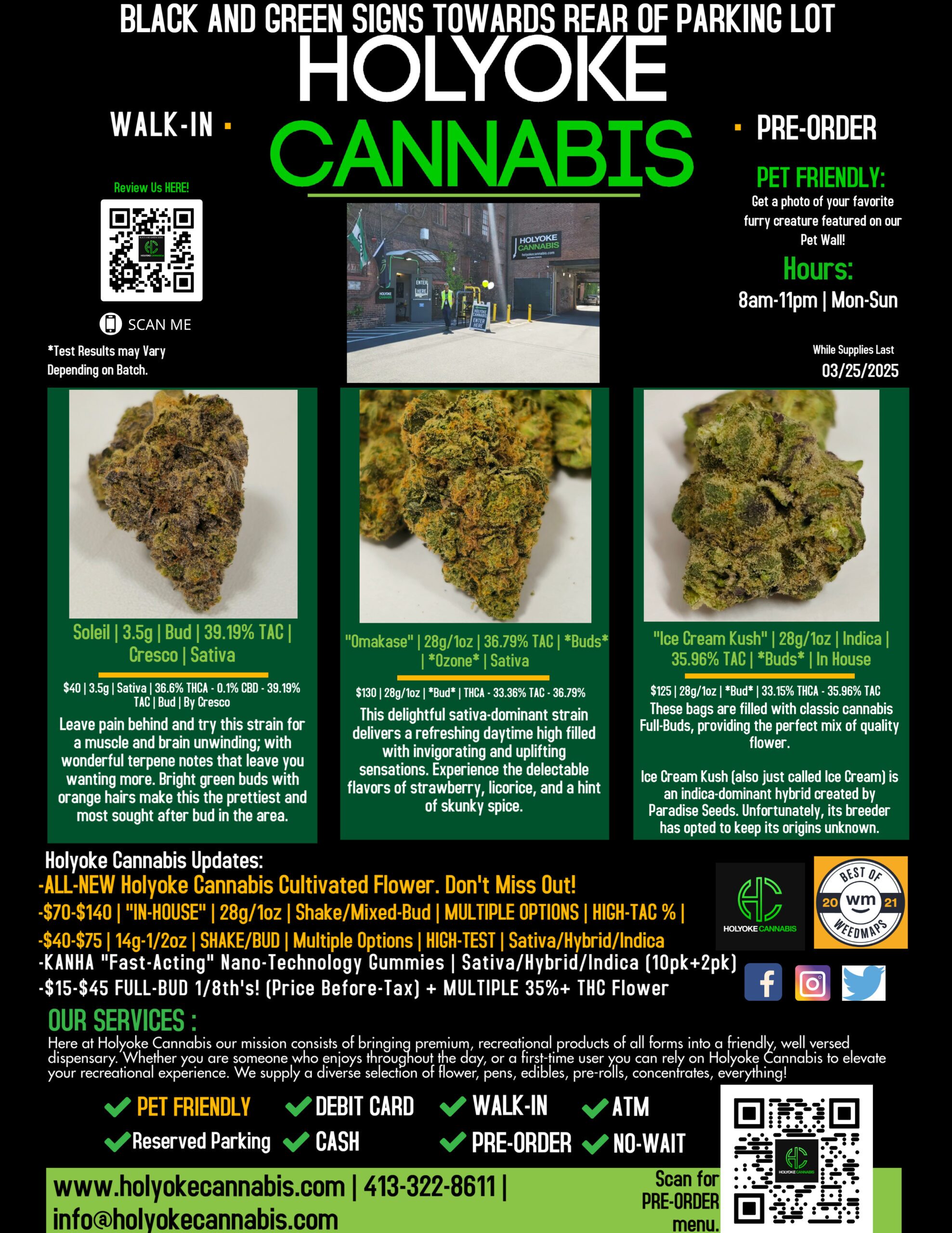What’s good Holyoke Cannabis tokers? Today we’ll be highlighting some of our favorite brands and products including “Soliel” 3.5g Flower by Cresco, “Omakase” 28g/1oz *Bud* by Ozone and “Ice Cream Kush” 28g/1oz *Bud* by In House! If you’re not really into flower, there’s tons of concentrate options at Holyoke Cannabis Dispensary you can check out HERE.