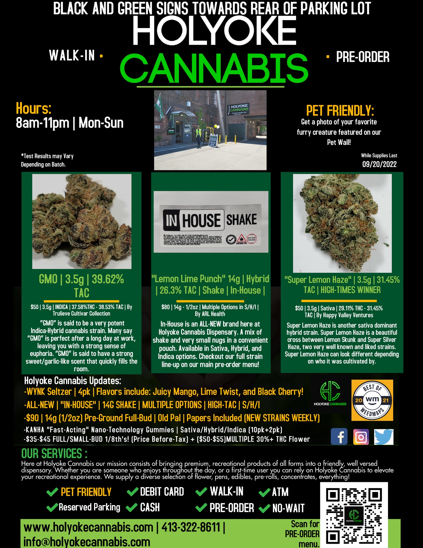 Holyoke Cannabis implements a wide range of sanitation and safety measures. Health and security are major priorities for their walk-in customers. “We are constantly sanitizing our sales floor and counterspace and offer both hand sanitizer and masks to all customers.” explains Jacob Black, Marketing and procurement Manager for Holyoke Cannabis. “Customers can also pre-order through our website www.holyokecannabis.com in order to decrease your time spent in store. We take our customers safety concerns extremely seriously.”. If you have any questions or concerns, please call 413-322-8611 and a Holyoke Cannabis Bud Tender will have the answer you need.
