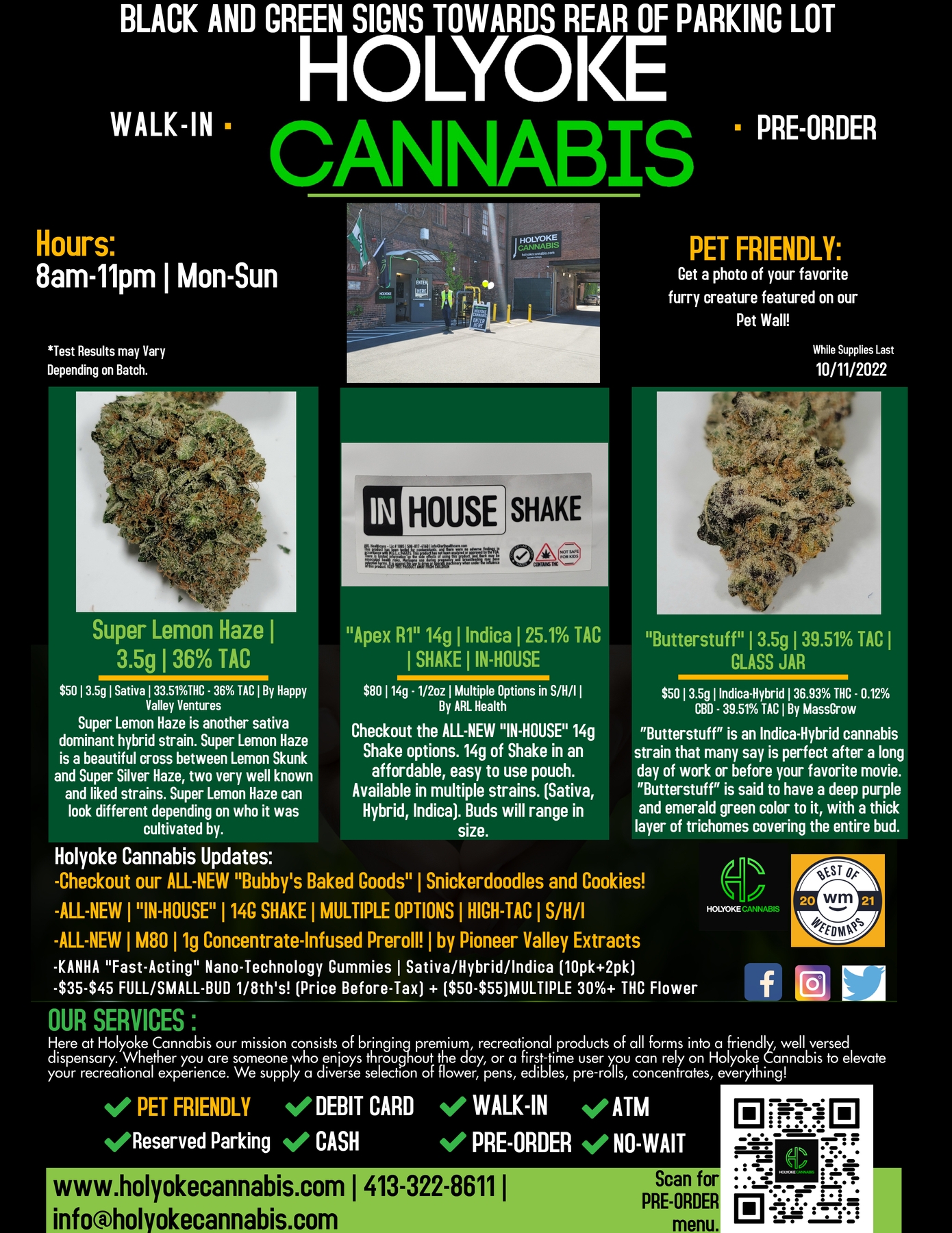 What’s good Holyoke Cannabis tokers? Today we’ll be highlighting some of our favorite brands and products including “Butterstuff” Flower” by MassGrow, “Super Lemon Haze” Award Winning Flower by Happy Valley Ventures and “Apex R1`” 14g SHAKE Bag by ARL Health. If you’re not really into flower, there’s tons of concentrate options at Holyoke Cannabis Dispensary you can check out HERE.