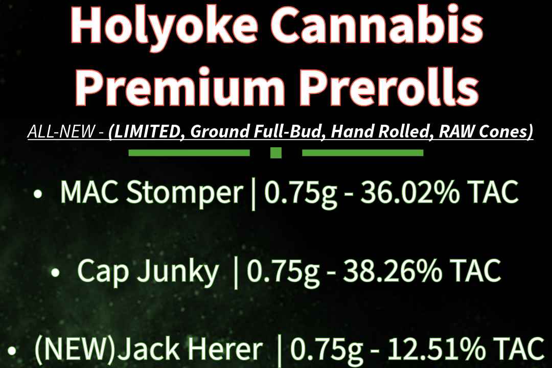 Holyoke Cannabis Dispensary | HC “Jack Herer” 1g M80 Infused Preroll (*NEW*) | HC “Cap Junky” 3.5g *BUD* – 41.25% TAC | HC *GMO* 3.5g Bud – 31.75%% TAC | (03/24/26)