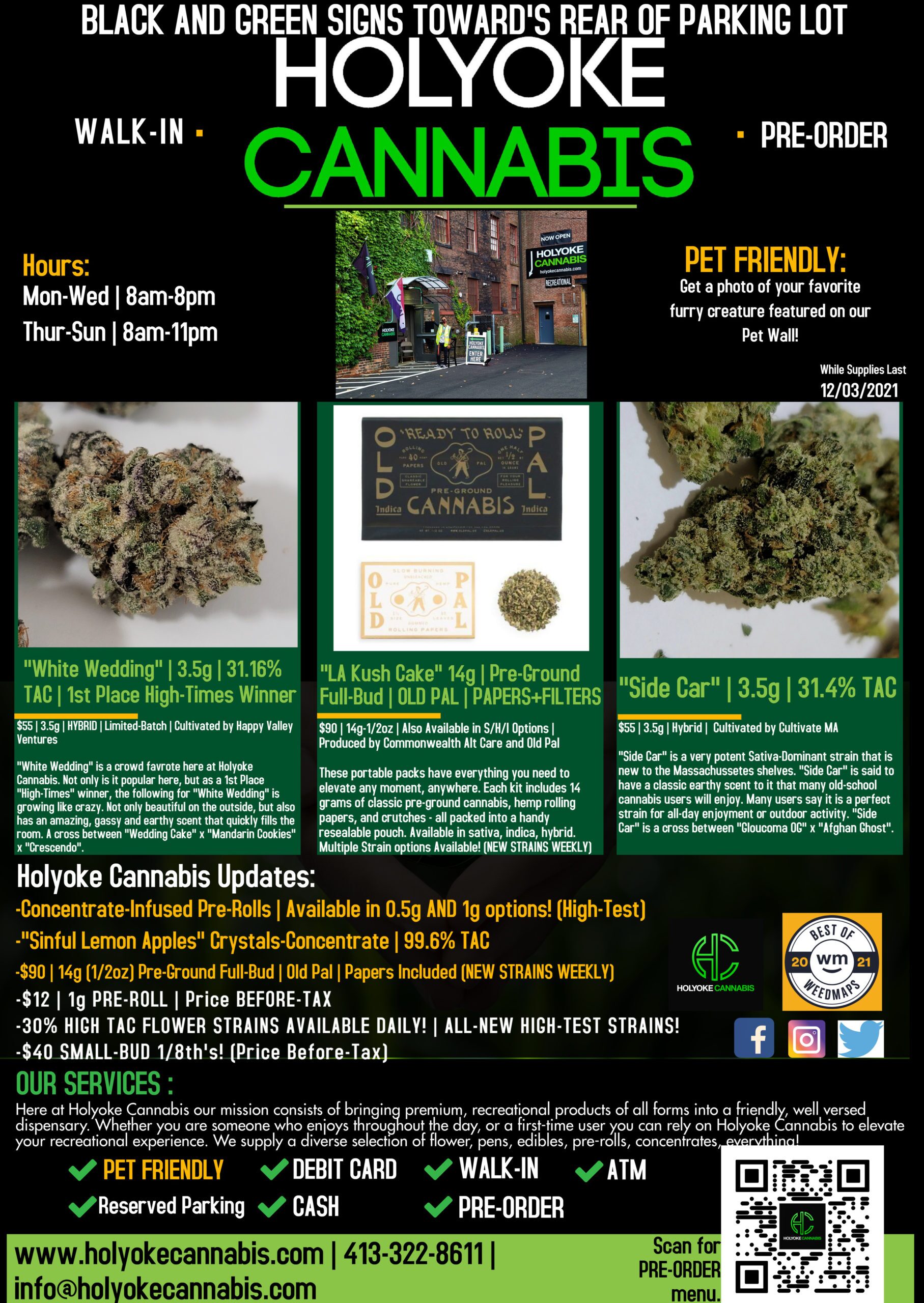 Holyoke Cannabis Dispensary 12/03/21: “White Wedding” Flower – 1st Place WINNER in the High-Times Cup and “Side Car” High-Test Flower
